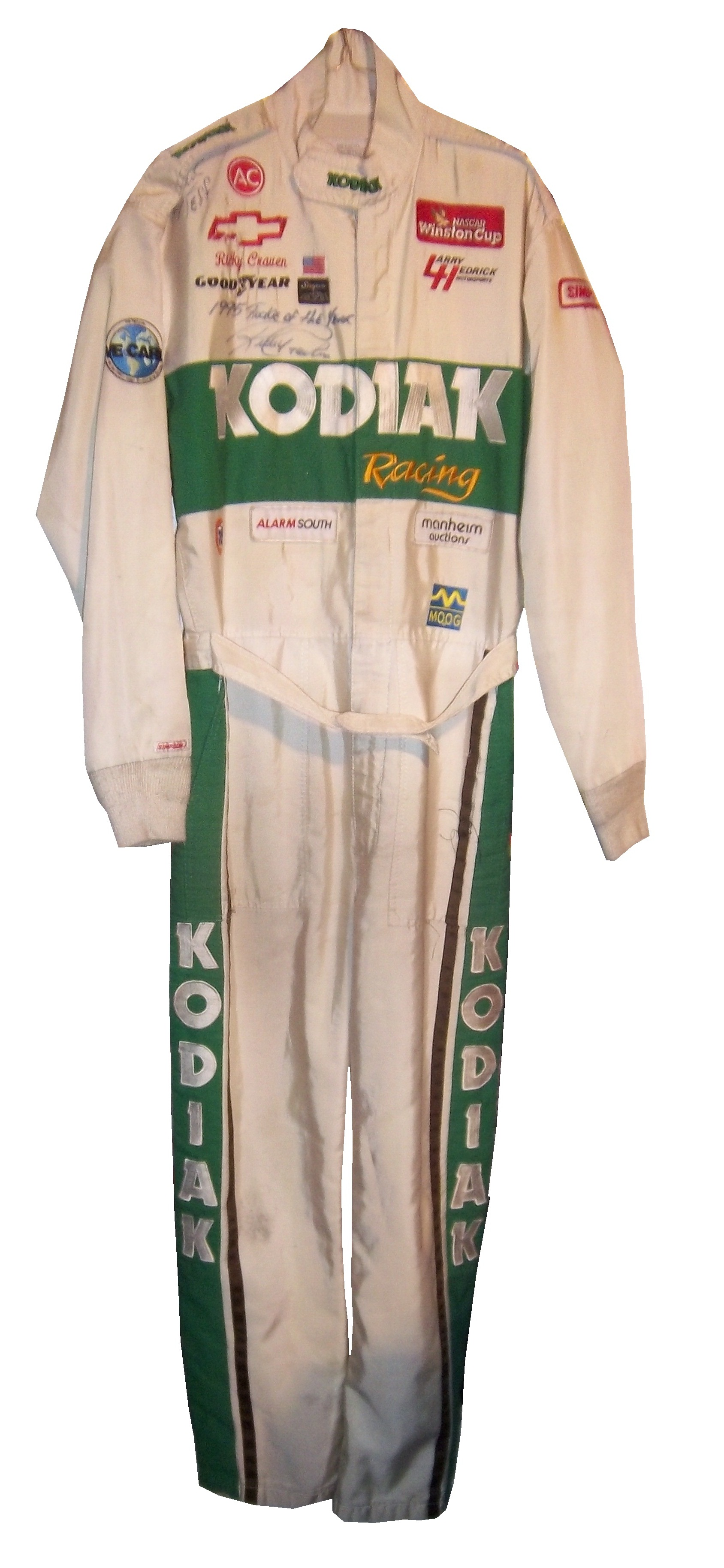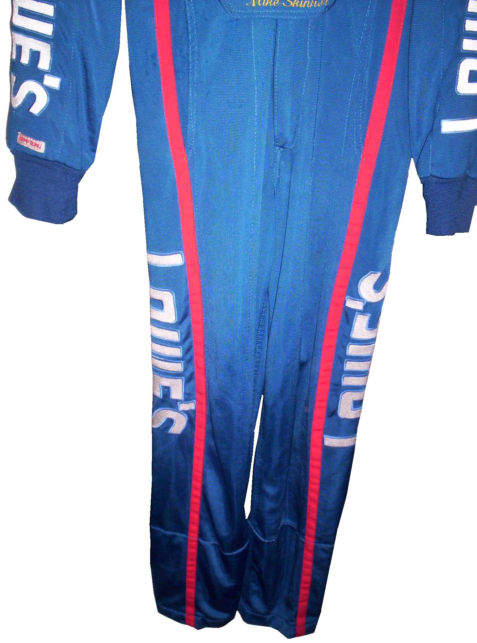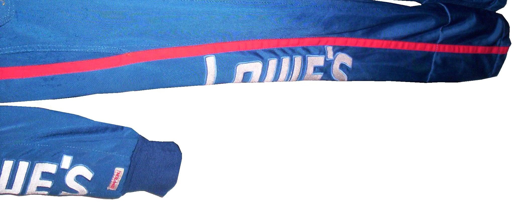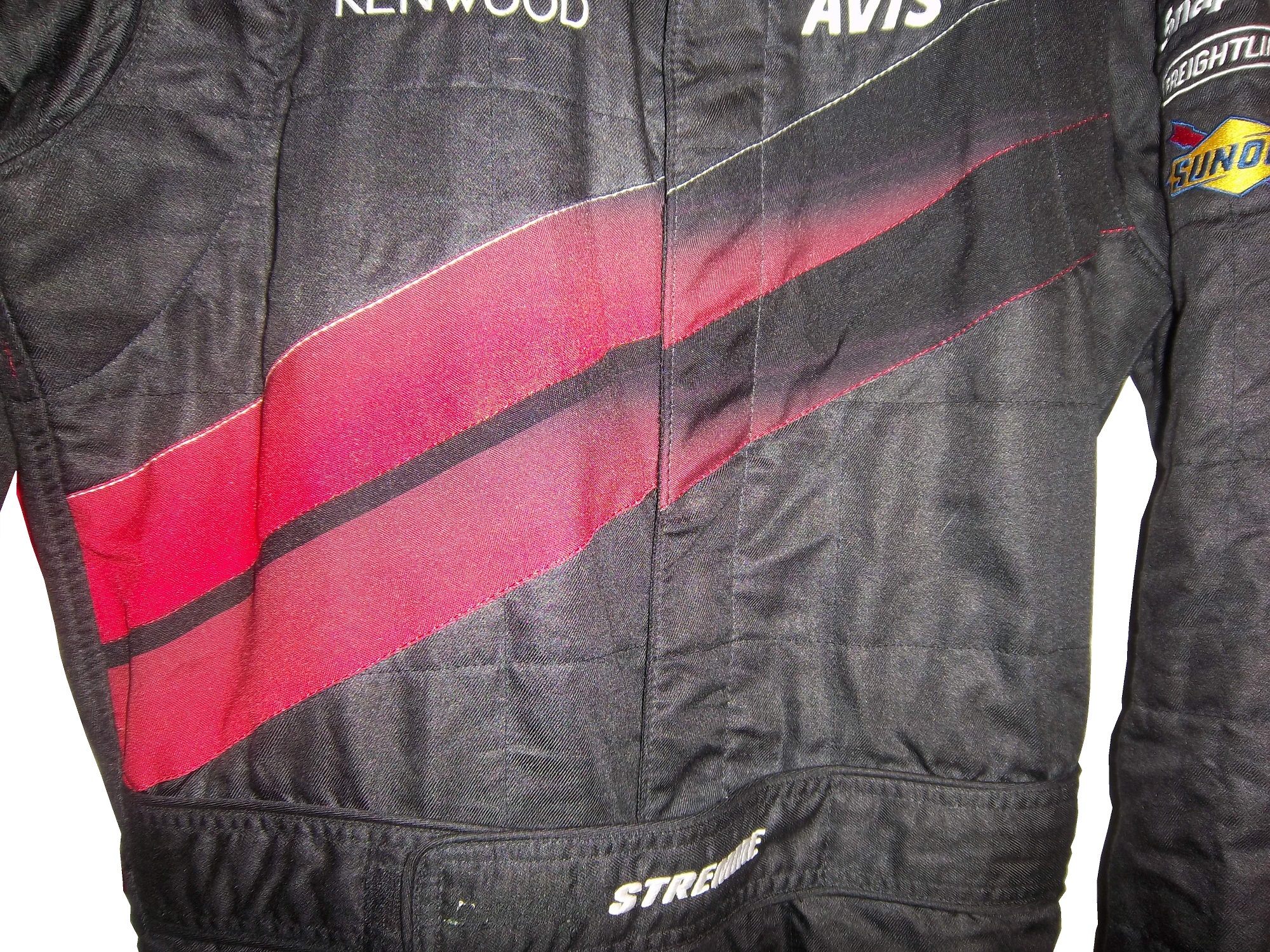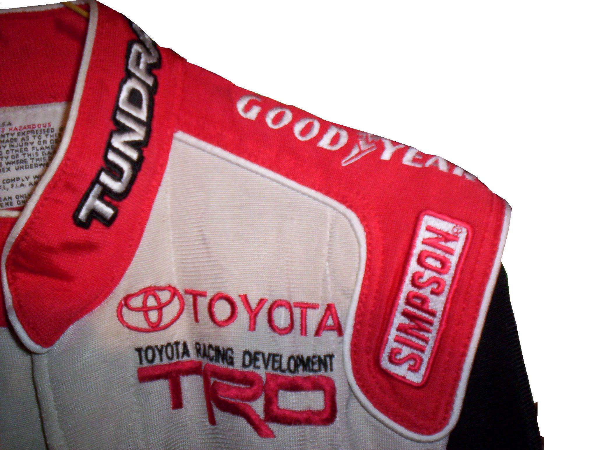Since then, SFI has certified safety equipment, and their certification is the standard in North America. This small patch is usually sewn into the inside wrist area on the left sleeve. This example, from a Terry Labonte suit from 2008, indicates that the suit meets “3.2A/5” standards. According to their site, this certification is standard for driver suits, and this suit would need re-certification in the next 5 years, or 2013. This certification is standard for many NASCAR suits, as shown below.