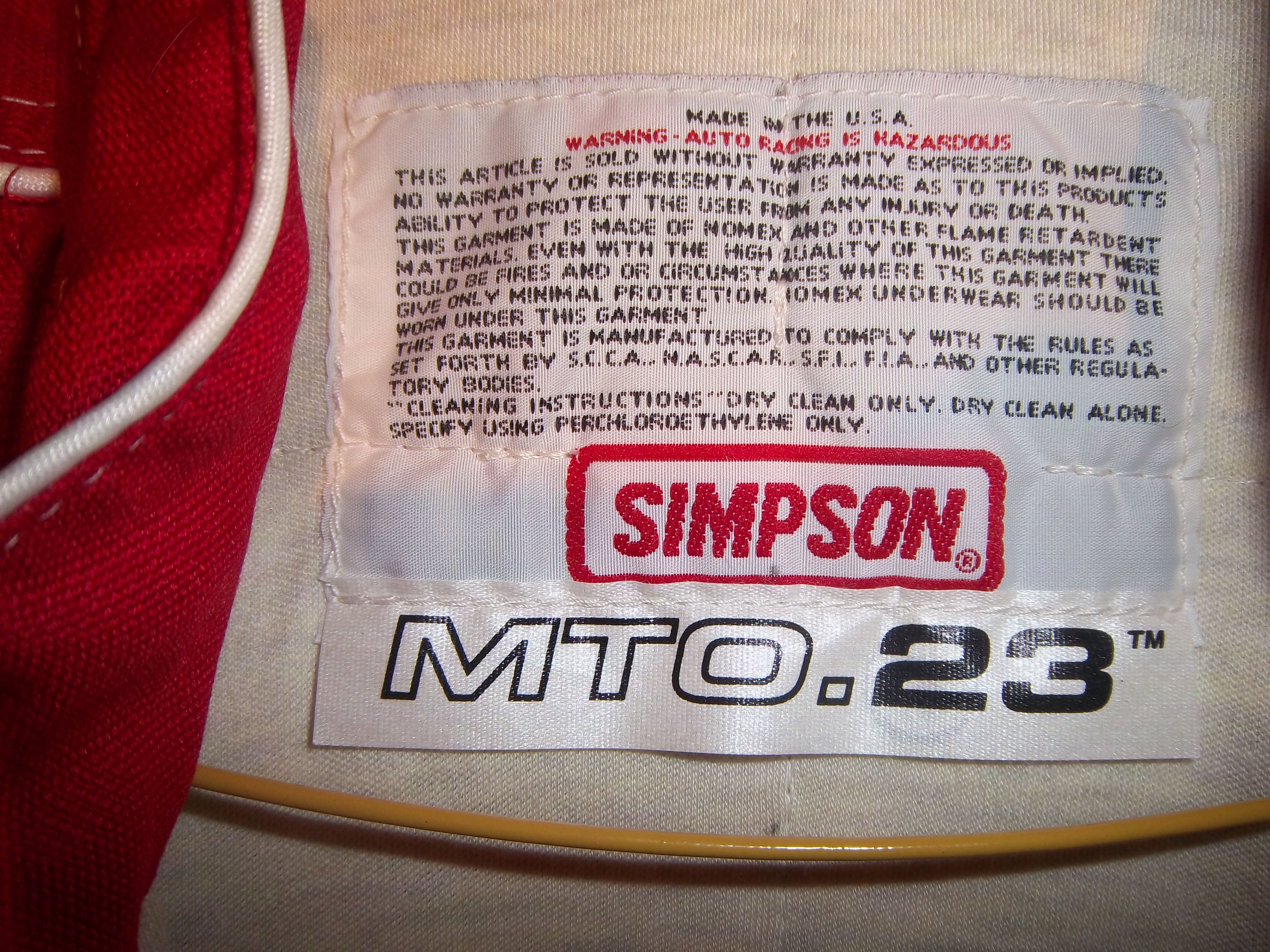 Older Sparco suits have cowl tags indicating the size, and in this case, the size is 56, which is a large, with a 42 chest, 36 waist, and 42 hips. It also has two liability tags, one in the cowl and one behind the zipper in front.