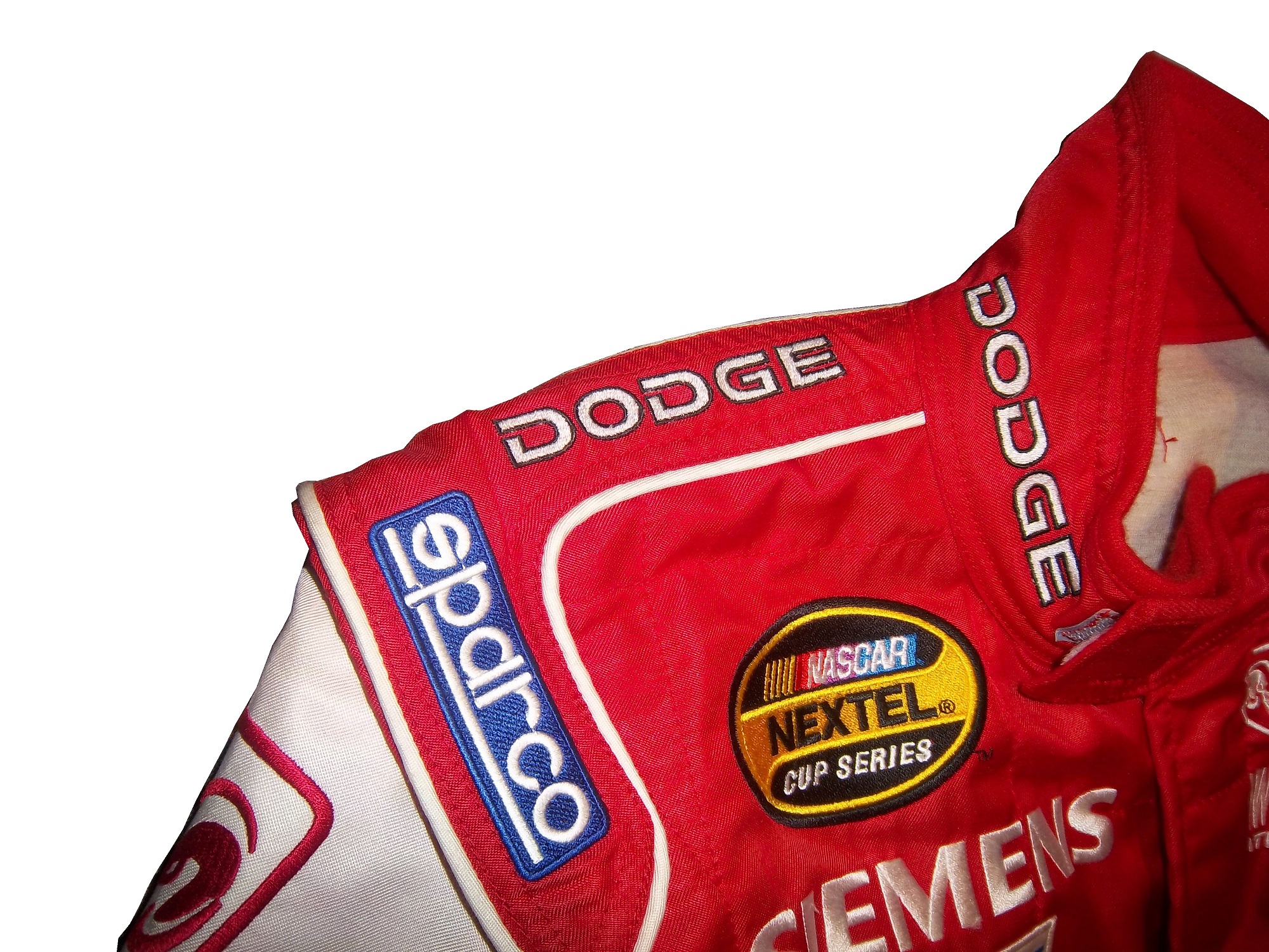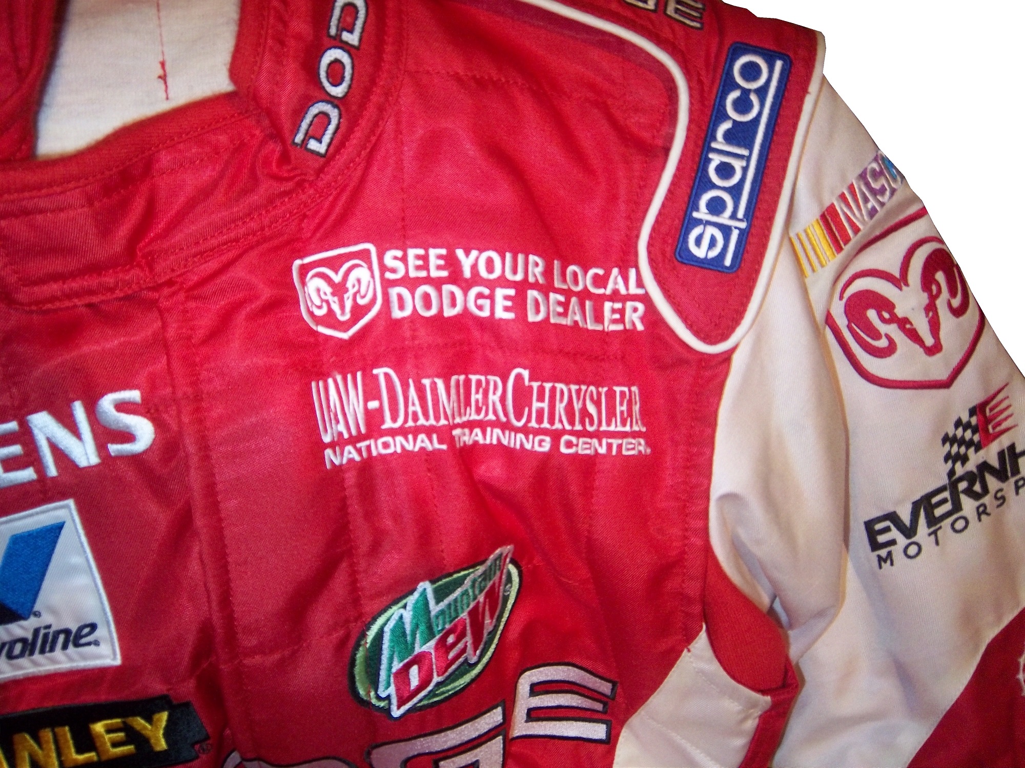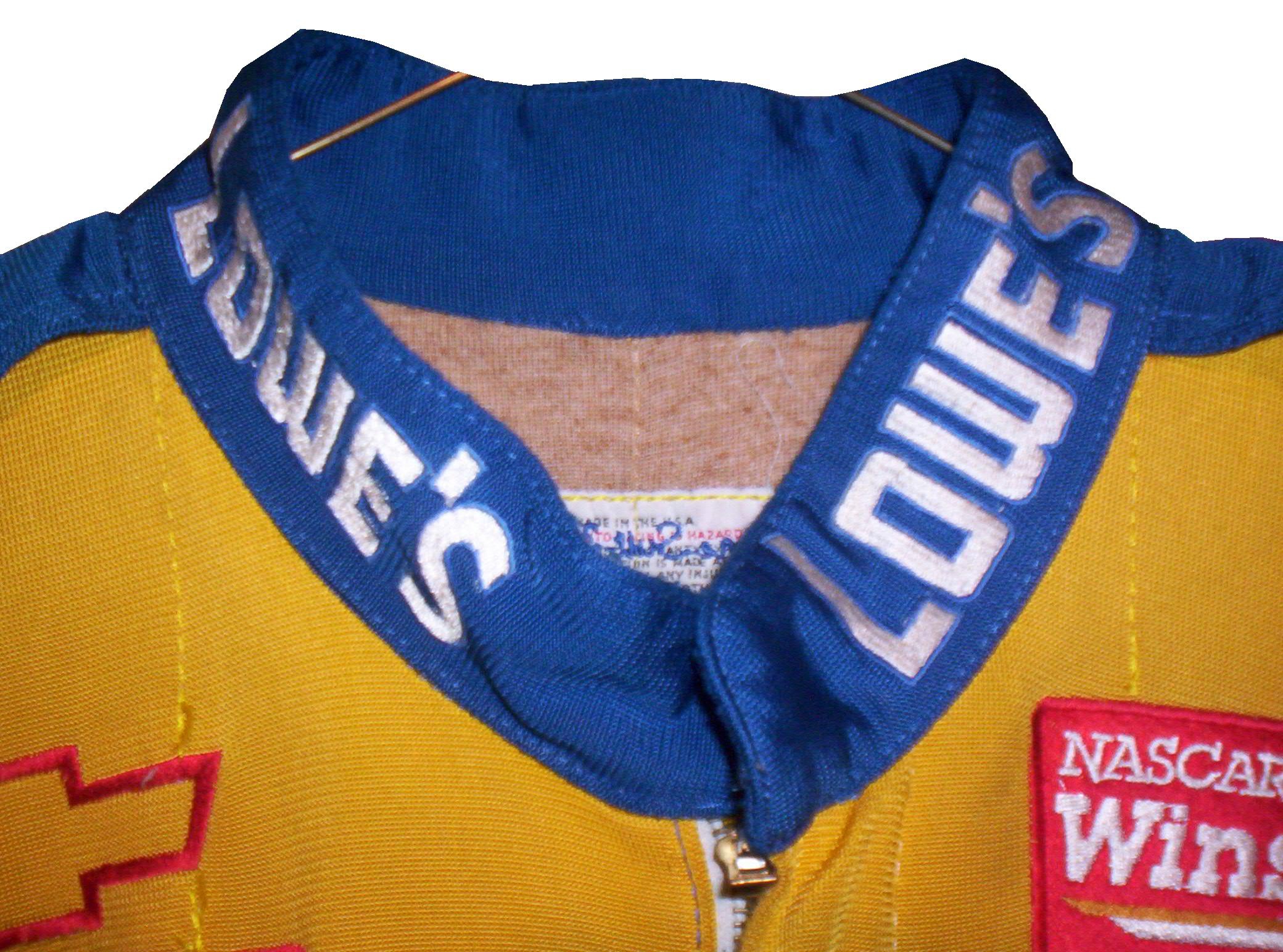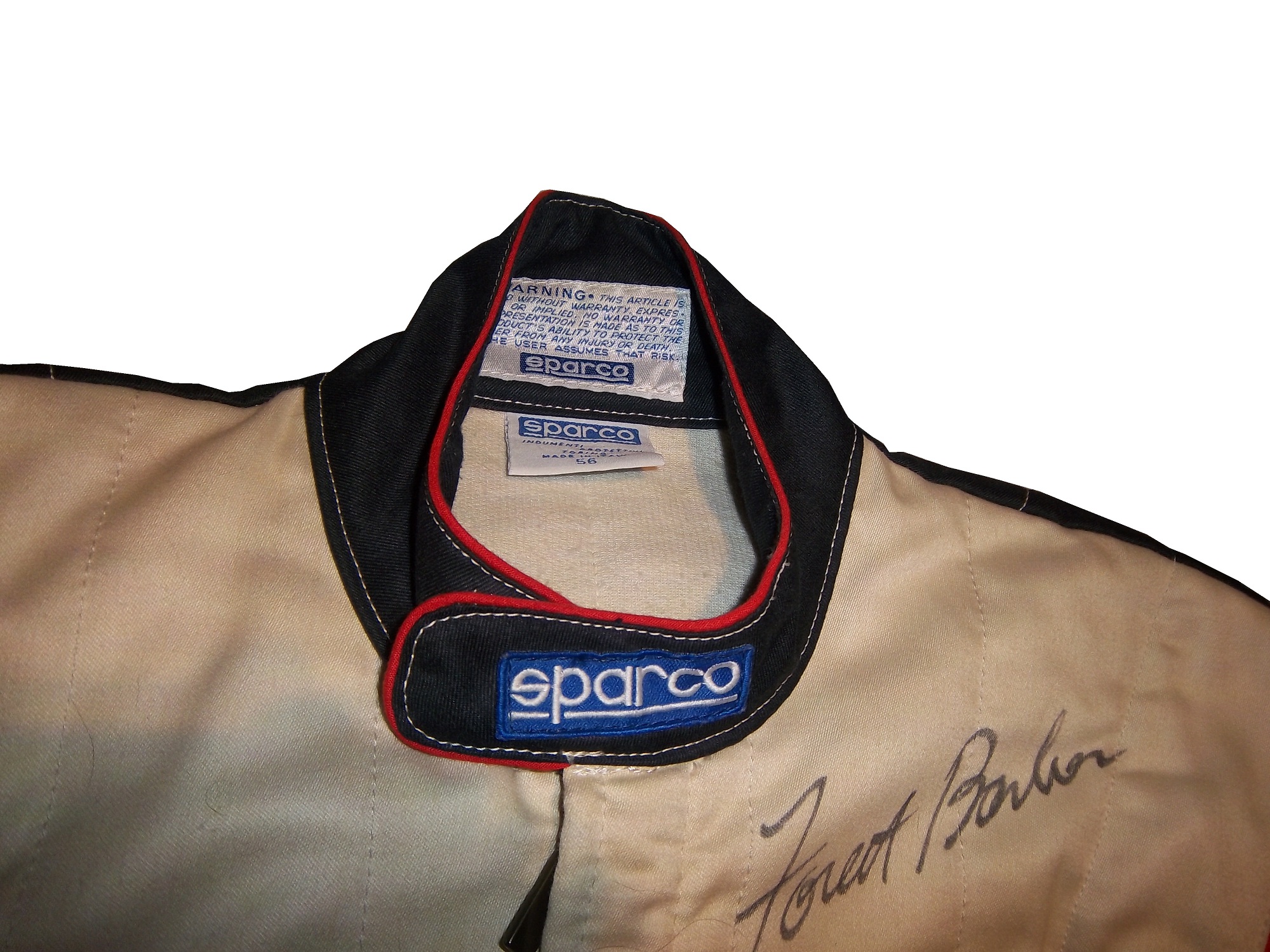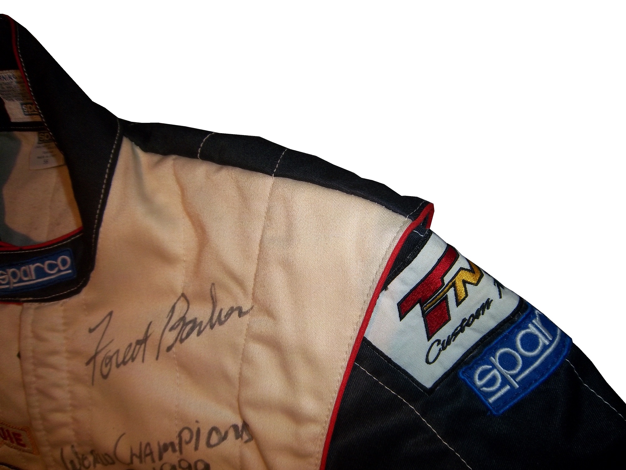I never thought I would cover offshore powerboat racing in this blog, but this suit is a very interesting piece. It is a Sparco brand, single-layer suit that has full FIA certification. The light weight is used to accommodate the life jackets, and safety equipment that powerboat drivers need in addition to fire protection. Drowning is a real safety concern in power boat and other water sports. The front is designed with small DRAMBUIE ON ICE, TUBI STYLE EXHAUST SYSTEMS and KEITH EICKERT POWER PRODUCTS patches. Forest has signed the left chest and added WORLD CHAMPIONS 1999 as well. The back torso features a large DRAMBUIE ON ICE logo.