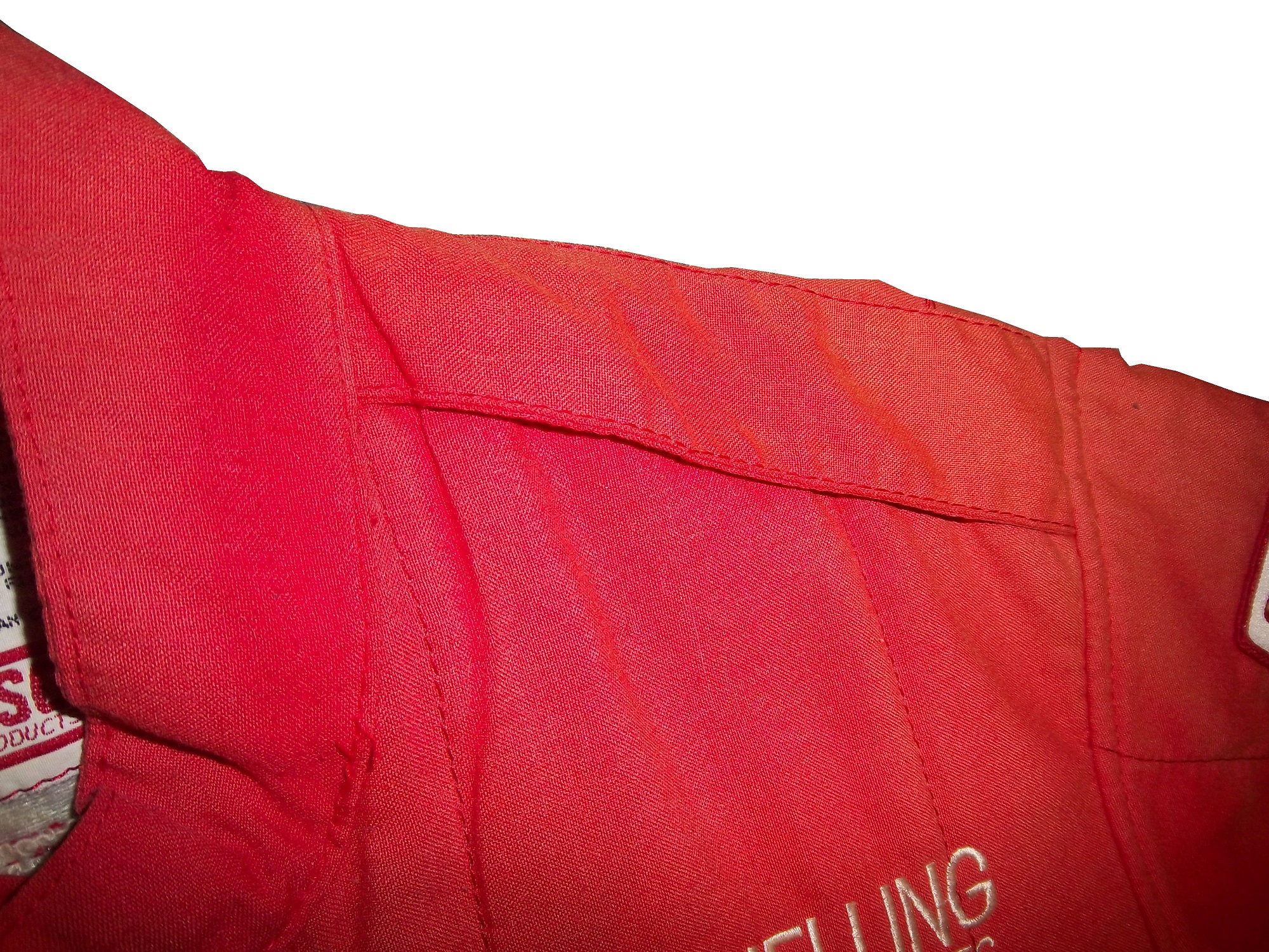 The shoulders have no epaulets or any other design covering the seam. Epaulets as I’ve said before are designed to pull an unconscious driver from a burning car. In offshore powerboat racing, drowning is a big concern in addition to fire protection, so epaulets are not needed. The arms are gusseted.