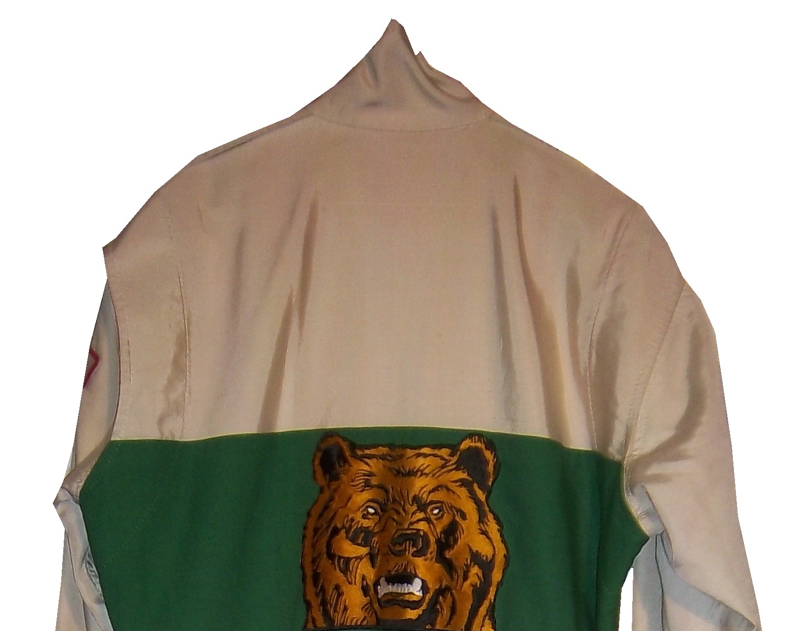 During that race, he wore this driver suit. It appears on this suit that a sponsor patch has been removed or fallen off. Now to understand the basic design, you need to understand that Nort raced in two races a year, and having a suit custom designed would be a needless expense. As such, his name, and two sponsor patches did the trick. Not fancy, but effective. This late 1980’s SCCA example is also a minimalist design, but it sticks to the “80’s stripe” design as the Ricky Craven example.