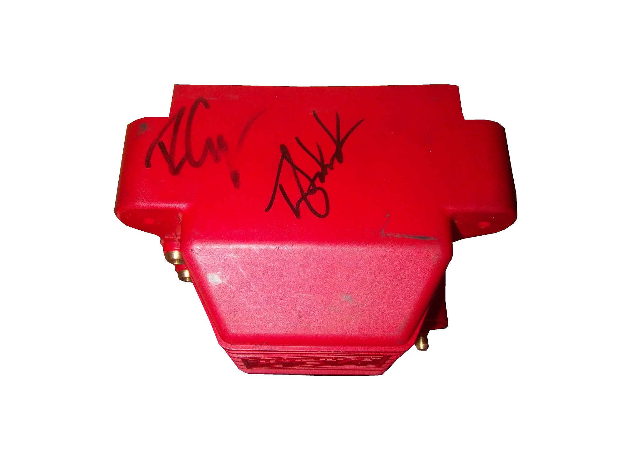 As well as an ignition coil and a spark plug from Morgan Lucas Racing. Ignition coils are used to turn on cars in general, but this MSD 8142 is designed to fire up these 8000 horsepower engines, which need a lot of electricity to start and operate. I was fortunate enough to have Tony Schumacher and Ron Capps autograph it in person.