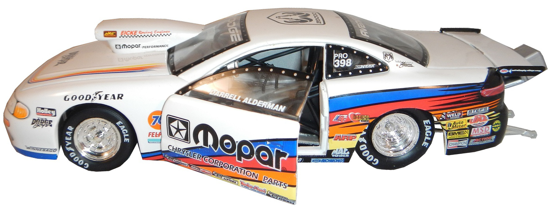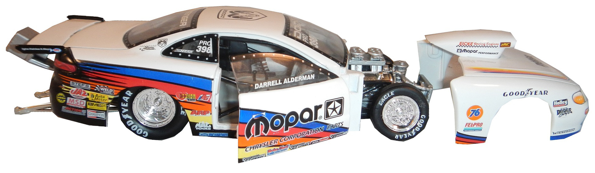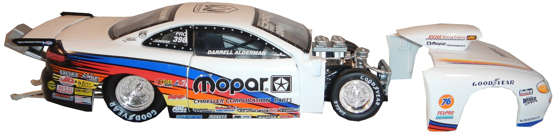 During my recent vacation, I found myself at a baseball card store. I bought a bunch of NASCAR die casts, as well as a Darrell Alderman 1:24 pro stock from 1997, where the doors open, and the hood comes off.