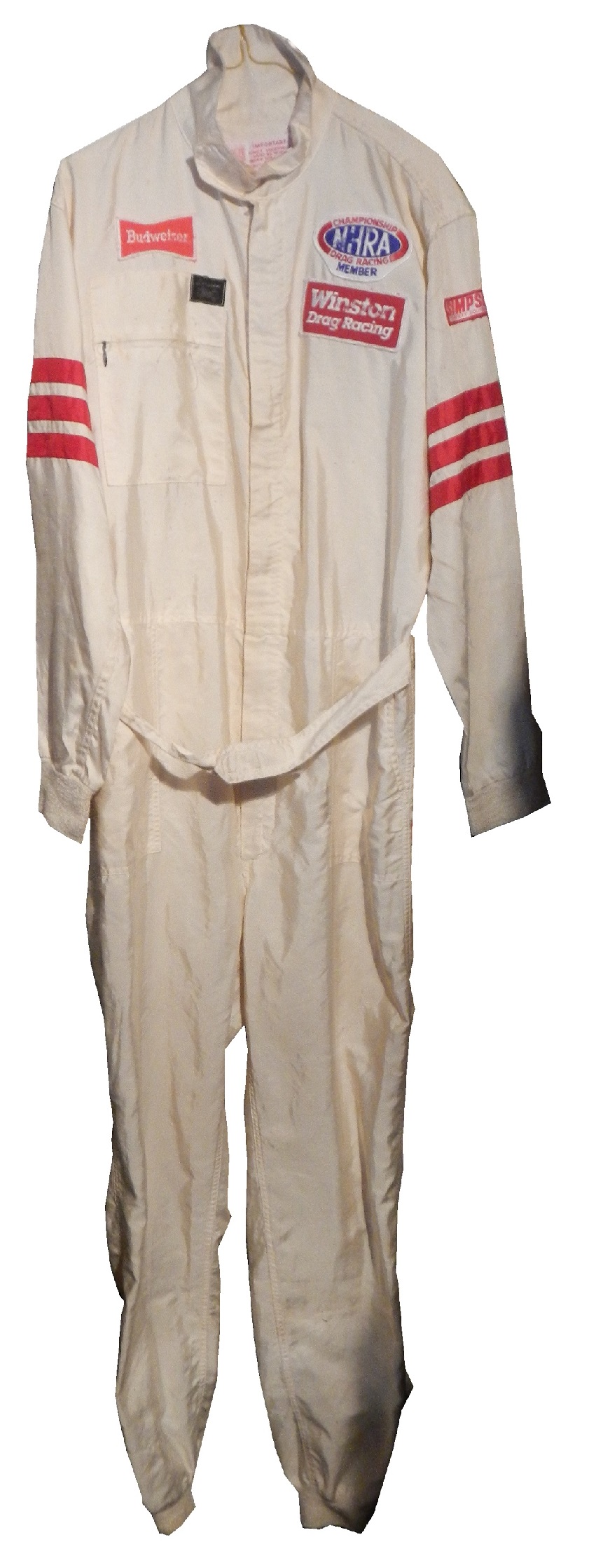 One of the more oddball items I have is this 1987 Budweiser/NHRA driver suit. Here is what I can say definitively about this suit: It was made in 1987, shows a lot of use, is not safety certified, and shows the Simpson open-wheel tag. Other than that, I don’t know much about this suit and I’m still working on it.