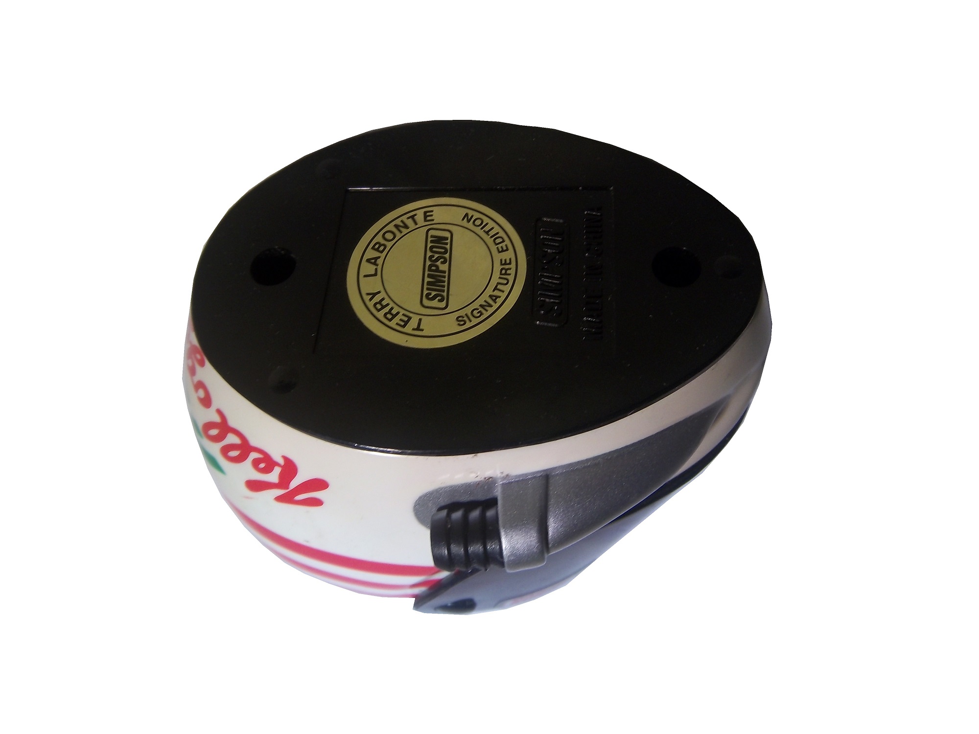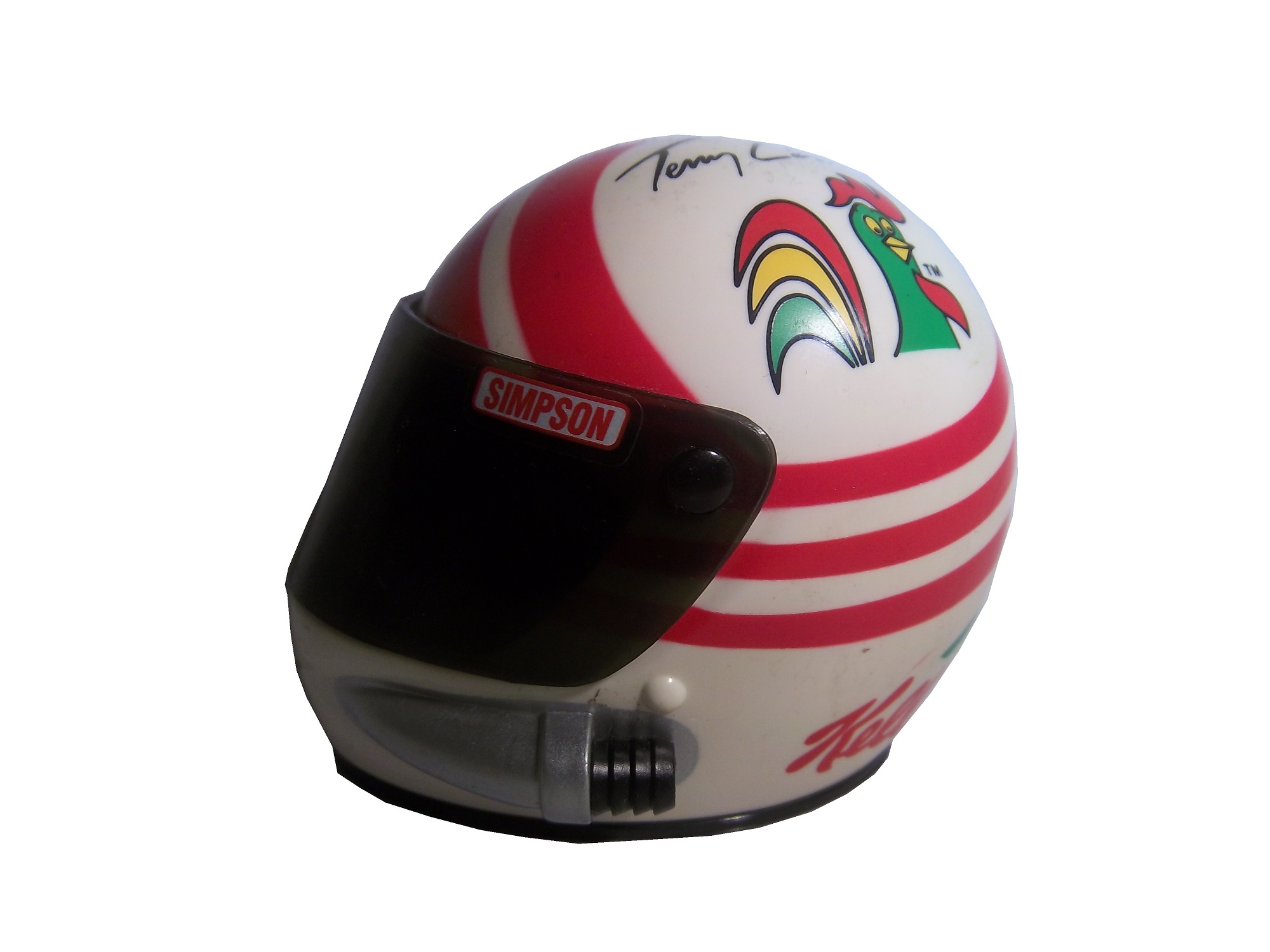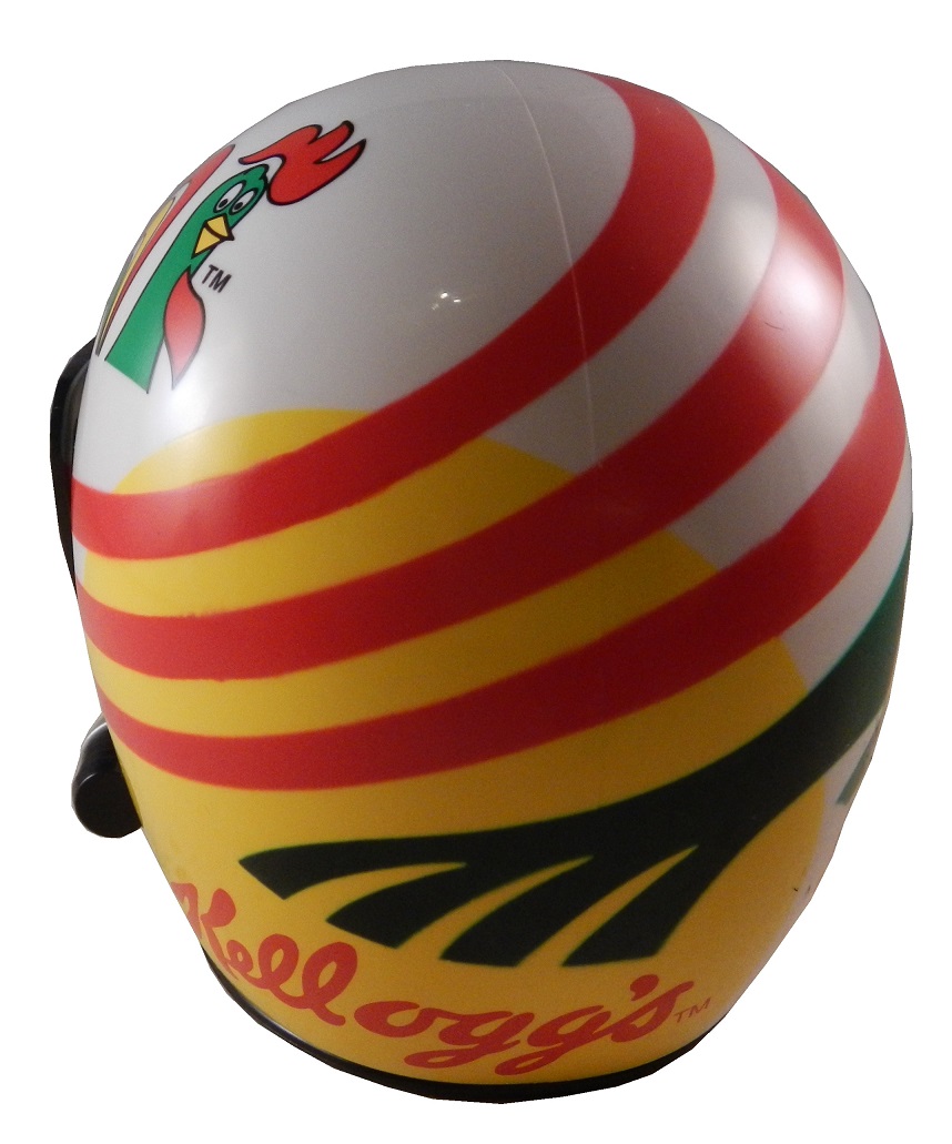 It’s not as elaborately designed as the Simpson models, but it is a nice looking piece. The visor is locked in the down position, and doesn’t seem to be the same design as his race helmet. The inside is hollowed out, and the inside is plain plastic. An inexpensive helmet like this would be great to get signed. It would also be a great promotional tool, that’s what is was used for. Seriously, what fan wouldn’t like an autograph from their favorite driver on one of these?