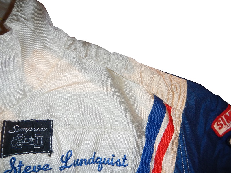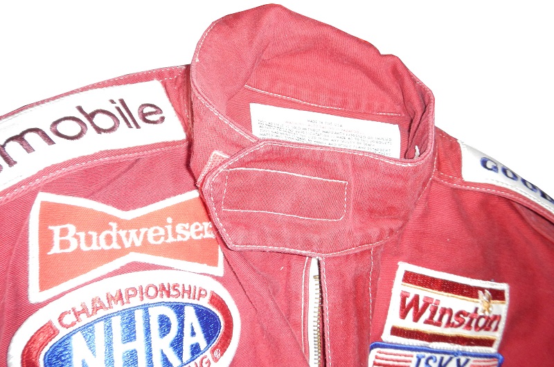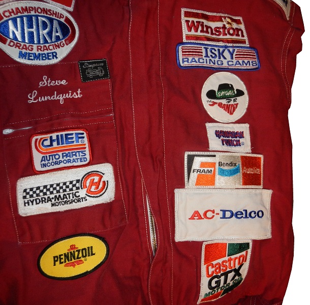 The chest is very patch laden, with the right chest features an NHRA MEMBER patch, above STEVE LUNDQUIST. Below that are CHIEF AUTO PARTS, HYDROMATIC and PENNZOIL patches.