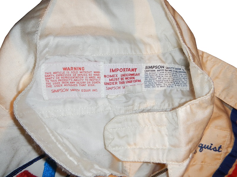 The standard Simpson warranty label is present inside the cowl. Additionally, there is a small flag indicating that the suit was made in January of 1990.