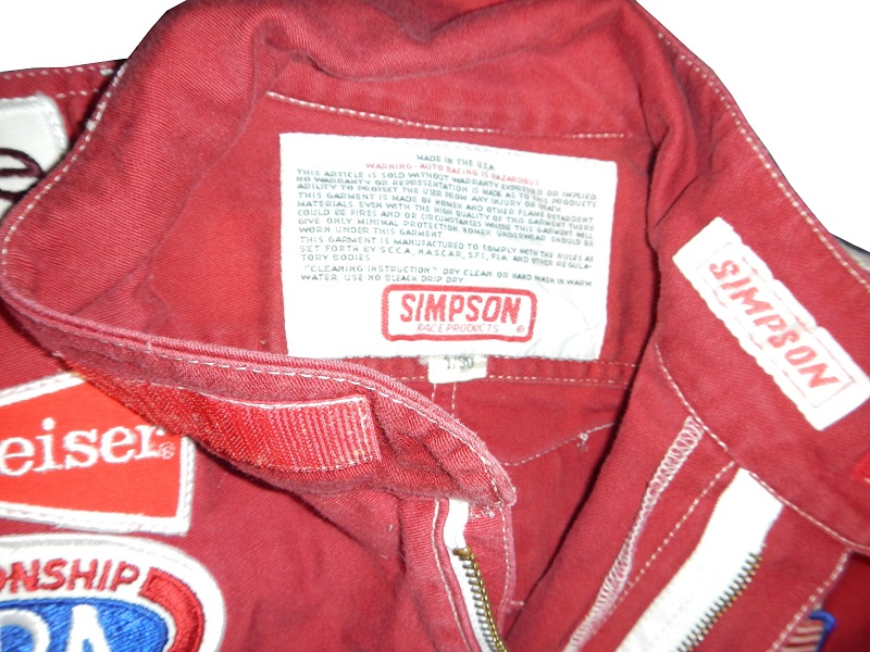 The left sleeve features a SIMPSON RACE PRODUCTS patch, and a JIM RUSSELL RACING SCHOOL patch. There isn’t much wear here.