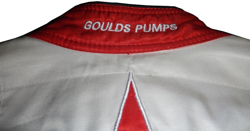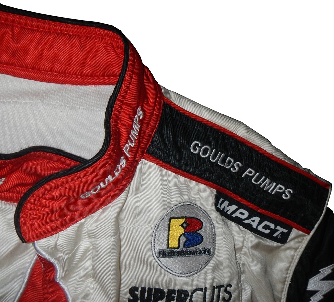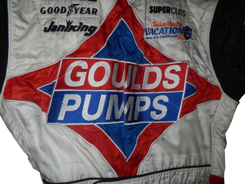 The shoulders have black epaulets, with red borders, and GOULD’s PUMPS embroidered into them. Impact Racing tags are present as well.