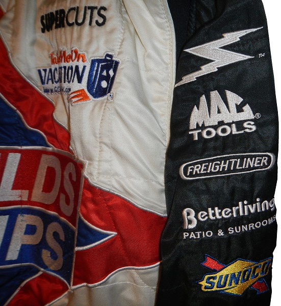 The left sleeve has IMPACT, MAC TOOLS, FREIGHTLINER, BETTERLIVING PATIOS AND SUNROOMS, and SUNOCO logos present, but no television logos.