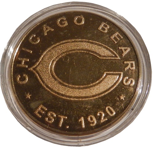 The HEADS side of the coin features a Chicago Bears “Wishbone C” logo, and CHICAGO BEARS EST 1920 stamped into it.