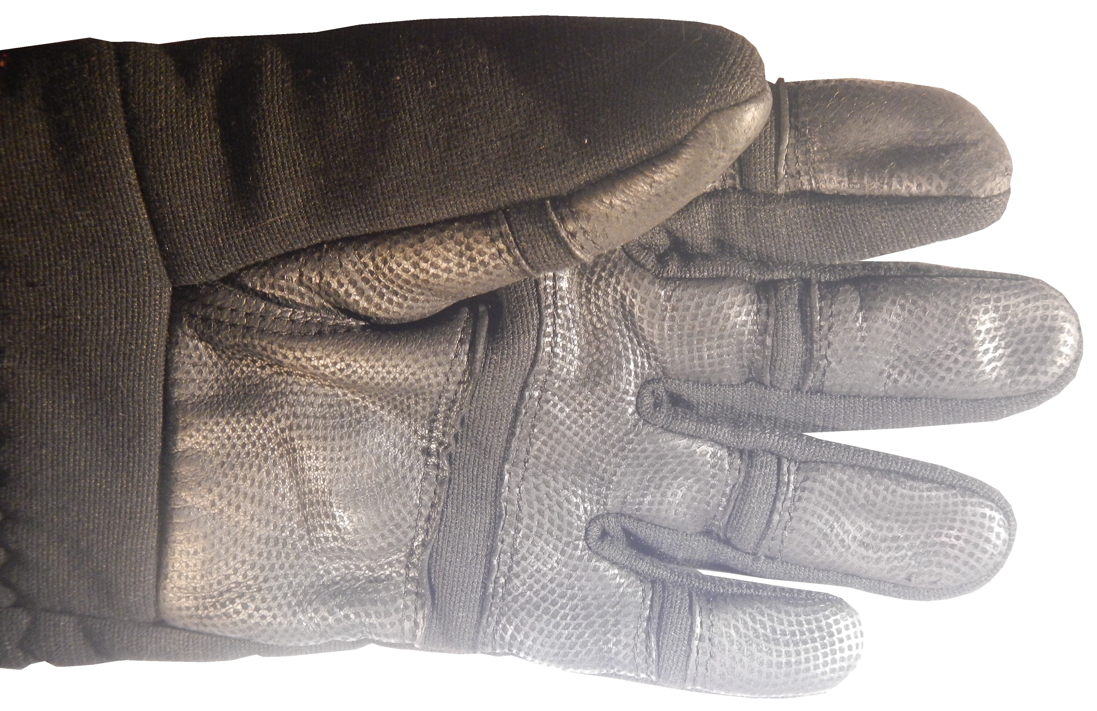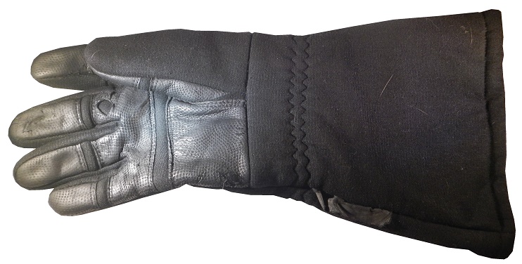 Funny Car drivers wear two sets of gloves while driving. One set is similar to what firefighters are wearing. The other is a thick set of gloves that extend all the way up to just below the elbow. They require a crew member to help put them on. This set of gloves worn by John Hale is a perfect example of those gloves.