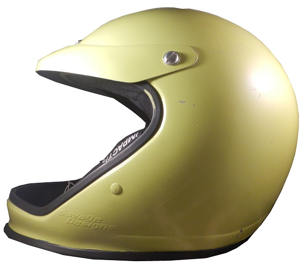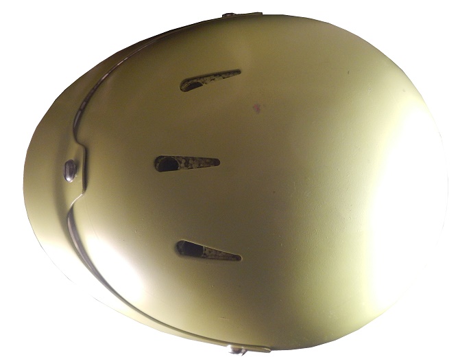 The helmet has numerous scratch marks present, and has obviously been repainted, as the old Savage Designs paint job is still visible underneath the green paint. Some of the scratch marks reveal that the helmet was blue.