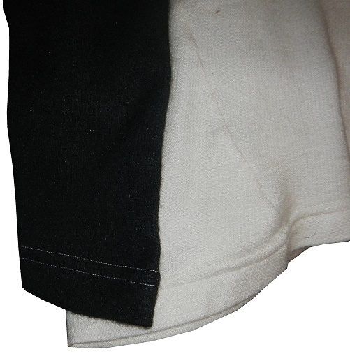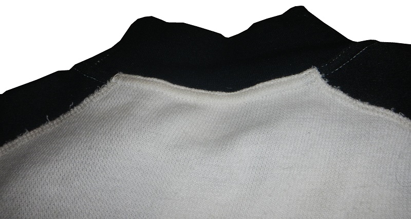 The shoulders and sleeves are in a black cloth, as opposed to the white front and back. They have no logos or patterns adornment.