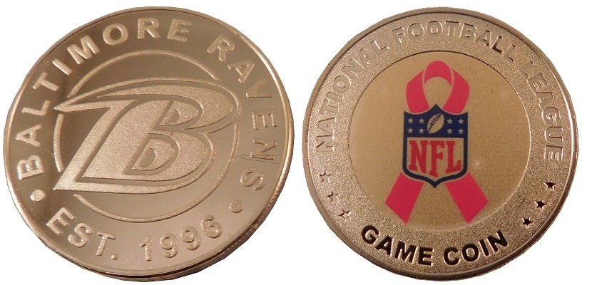 As has been discussed on The Driver Suit Blog before, I’m a fan of game-used toss coins. I have a collection of them from different events, and this week, we are going to look at a pinkwashing coin from 2011. 2011 was a great year to be a Ravens fan. With a solid 12-4 record, it looked as though the Ravens would be the Super Bowl champions, but in the AFC Championship, they lost in a shocker to the New England Patriots, who would win the championship.