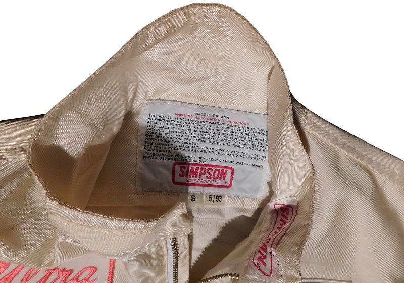 The cowl tag is a Simpson non Nomex variation, with two flag tags. One is a size tag indicating S, the other is a made on tag indicating it was made in 5/93.