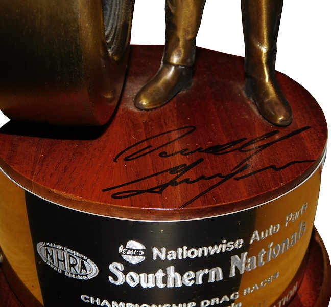 At the 1985 Southern Nationals, Don Garlitts beat Joe Amato to take the event Wally, but the best looking car Wally would go to Darrell Gwynn, in his 1985 Dave Uyehera made top fuel dragster. I recently acquired the Wally from the event, which Darrell has autographed.