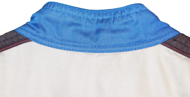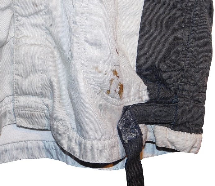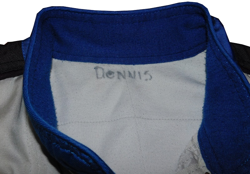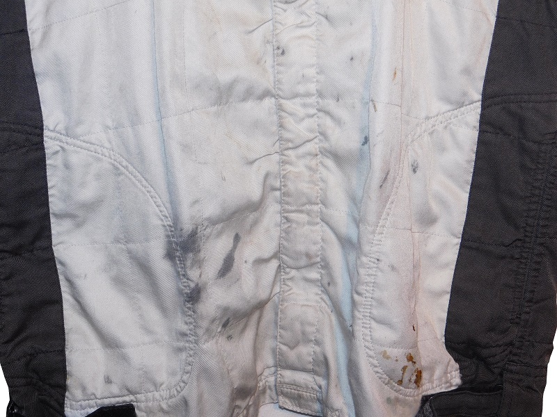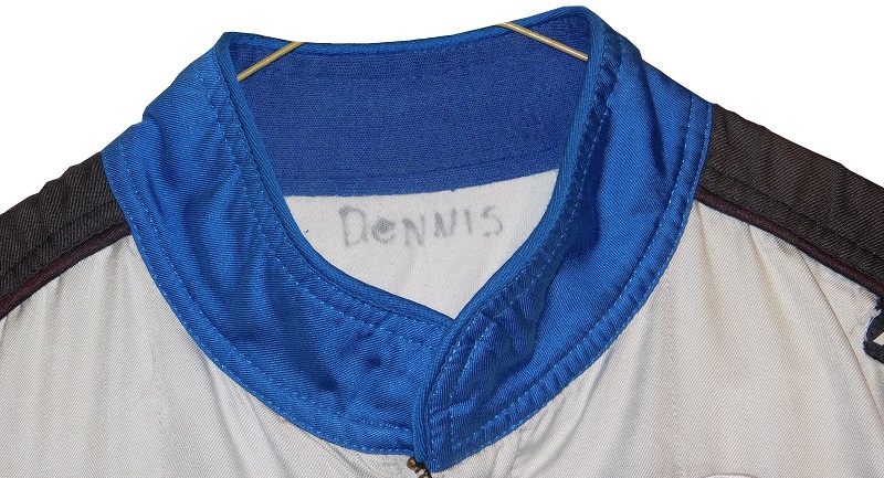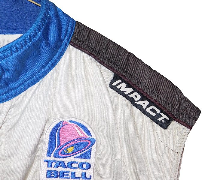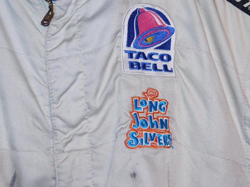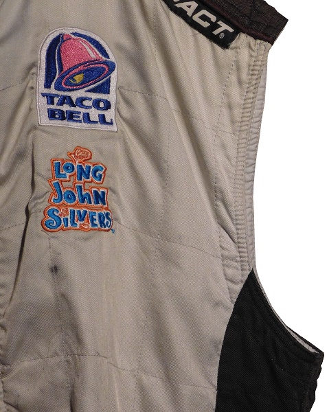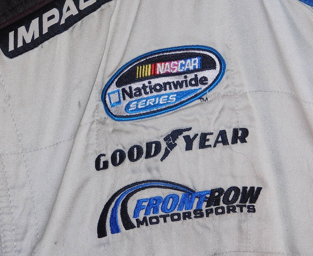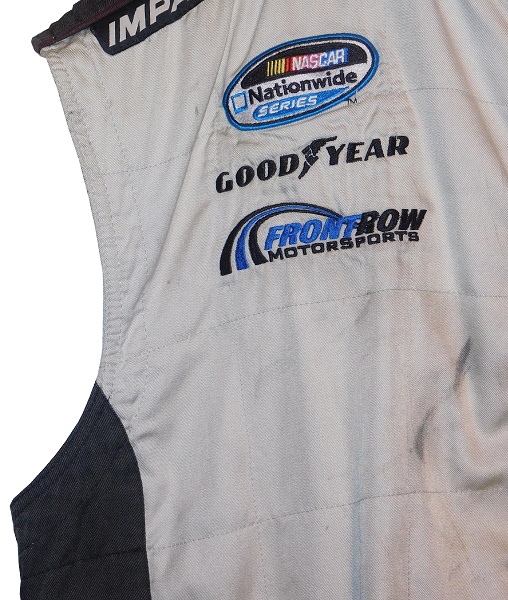 The collar is unadorned, and there is no tag in the cowl, though the name DENNIS is written in faded Sharpie .The right chest features a NASCAR NATIONWIDE SERIES logo, a GOODYEAR logo and a FRONT ROW MOTORSPORTS logo embroidered into it.The left chest features a TACO BELL patch,and a LONG JOHN SILVERS logo embroidered.The front torso is unadorned, but it has a large amount of black staining present on the white material.Underneath the front logo, next to the zipper is a tag that indicated that the vest was also worn by “Ryan” as that is written in faded Sharpie, and the warranty tag.Impact has special Velcro adjustment straps on the hem, and this vest is no exception. The vest epaulets are black strips with no logos present. The standard vest sleeve holes are also present. The rear of the vest is unadorned shows some dirt and scuff marks below the logo.The back of the neck is unadorned.The back torso of the vest has a lot of dirt visible on the white material.While Front Row had little success in the Xfinity Series, it wasn’t enough to justify them continuing to compete in the Series, especially when they switched from Chevy to Ford in the Cup Series starting in 2010. It’s also understandable that multiple crew members would wear this vest. These vests, though an affordable option to one-piece suits, are still expensive to produce, and if a crew member leaves the team, the vest can still be used with another crew member. I love uniforms like this that shows a lot of wear. You don’t see that too much in racing memorabilia.