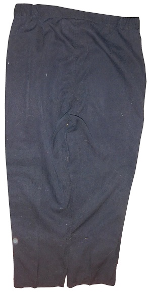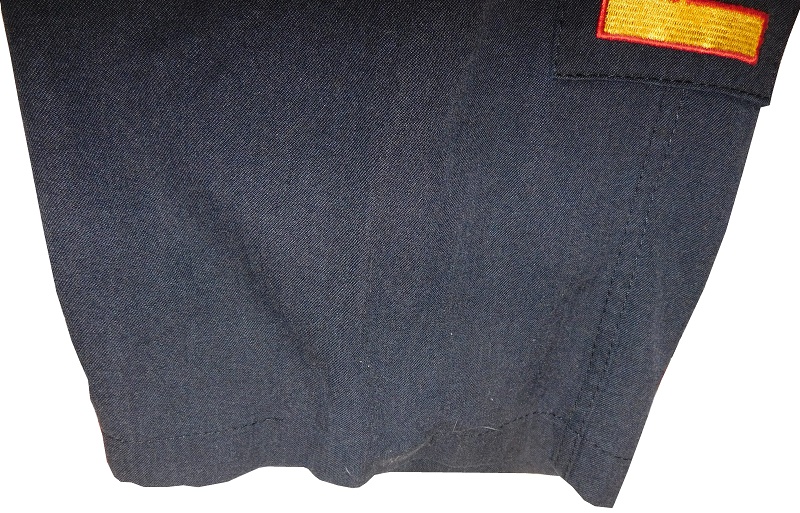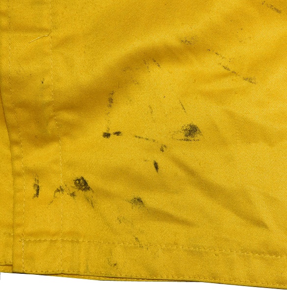 Contrasting with the jacket, the pants are black with yellow lettering, and show light use.