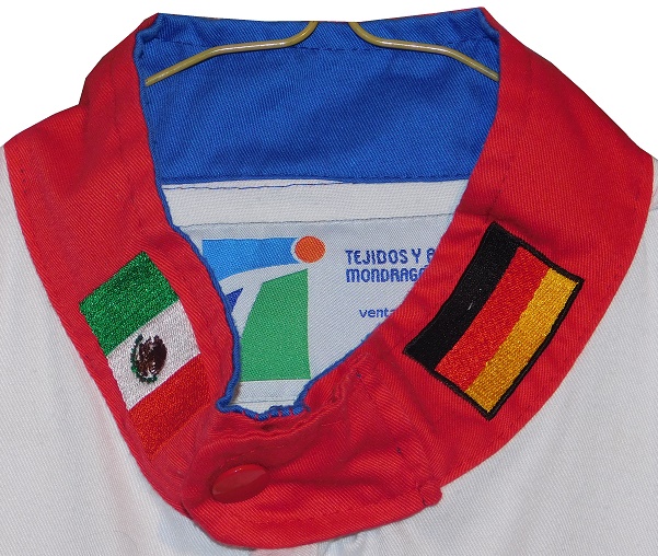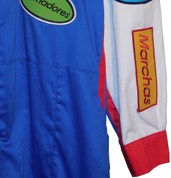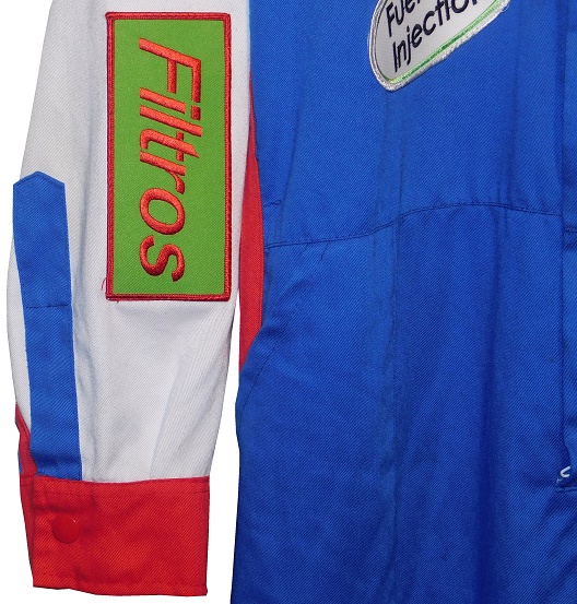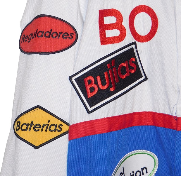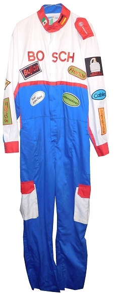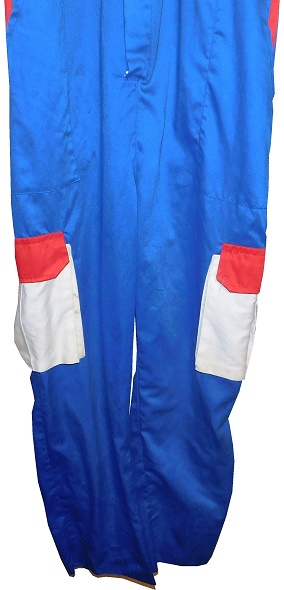 The collar has a button snap, with a Mexican flag on the right side, and a German flag on the left.The suit is made by Tejidos y Acabados Industriales S.A. de C.V.. Their manufacturer tag is located in the cowl.The chest has a large BOSCH logo, and four patches, which read BUJIAS which translates to plugs, FRENOS which translates to brakes, ALTERNADORES which translates to Alternators, and for some reason, FUEL INJECTORS in English, which would translate to inyectores de combustible in Spanish.The suit has no beltThe blue legs have white pockets with red closures on them.The shoulders have red epaulets, with Robert Bosch GmbH logos and AUTOMOTRIZ, which is Spanish for automotive. The sleeves have patches. On the right sleeve, the upper patches have REGULADORES which translates to regulators, and BATERIAS which translates to batteries, and the lower sleeve has FILTROS which translates to filters in television position. The left sleeve has a black patch, with a spark plug design with 20 ANOS DE BUJAIS DE PLANTO embroidered into it. That translates to “20 years of platinum sparks.” There is a second patch with CABLES,and a third patch, with MARCHAS, which translates to Marches, which is an automotive term in Mexico. The back of the suit shows no wear.The neck is in red fabric and has no adornment on the back of the neck.The back torso has a BOSCH RACING TEAM logo embroidered into it.Bosch continues to be a force in automotive, industrial and home improvement technology. Being the largest auto part company, and a major supplier of industrial equipment and power tools, they are invested in most industries in the world. They are a well-known sponsor of auto racing as well, sponsoring events and cars.