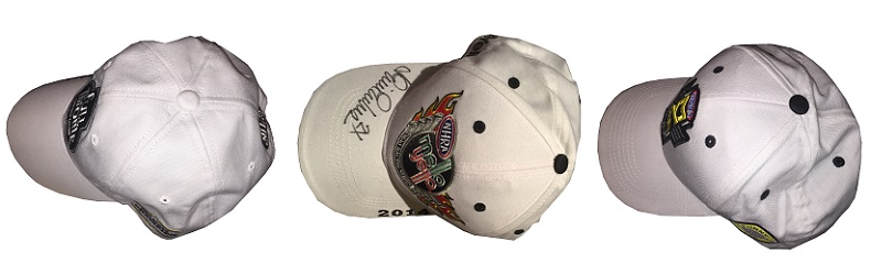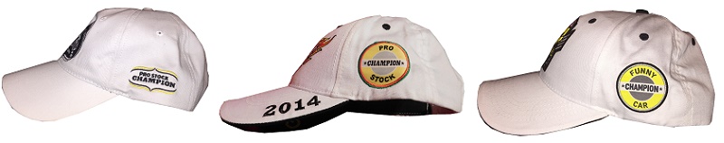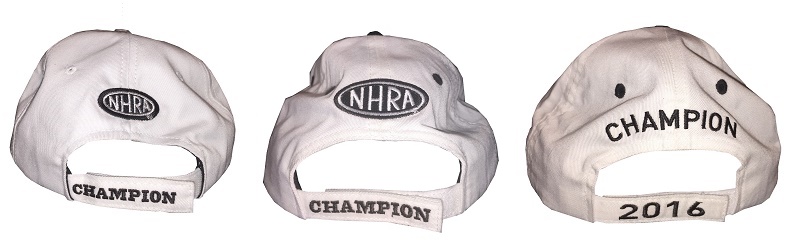 The back of the 2010 Full Throttle cap has an NHRA logo, which was needed since the front only has a Full Throttle logo. The word CHAMPION is embroidered on the Velcro closure. This design is mimicked on the 2014 Mello Yello cap, albeit with a larger NHRA logo and slightly larger lettering on the Velcro closure. In 2016, the caps got an update, with CHAMPION above the closure and 2016 on the closure.