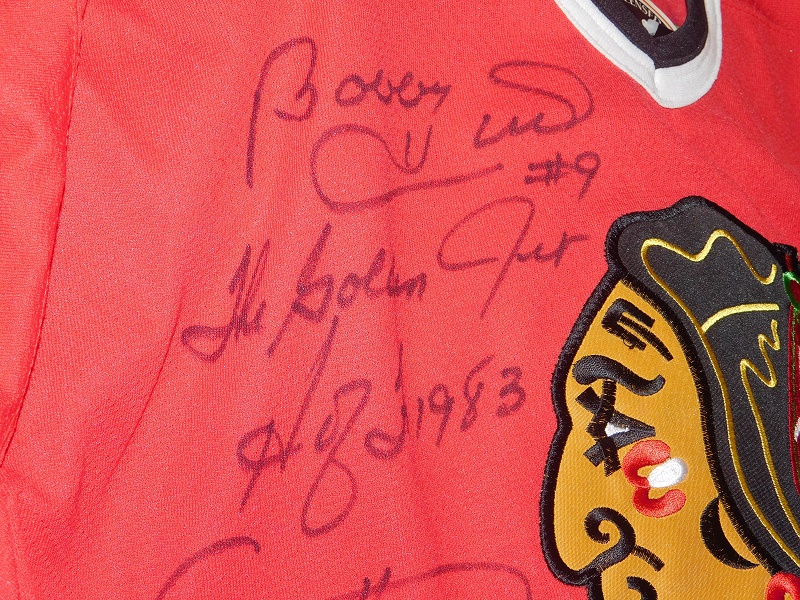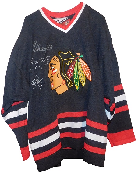 I also have two Blackhawk jerseys, one signed by Bobby Hull, Pierre Pilote, and Steve Larmer. The other one is autographed by Alex Zhamnov, Pierre Pilote, and Steve Larmer.