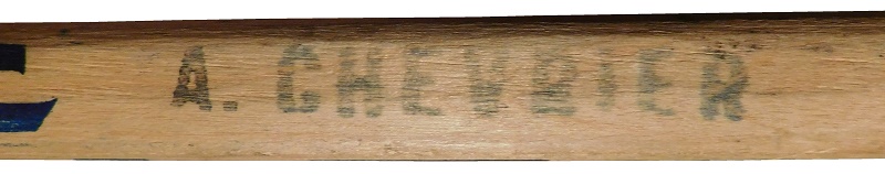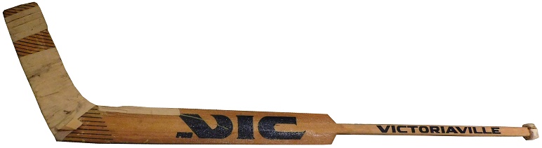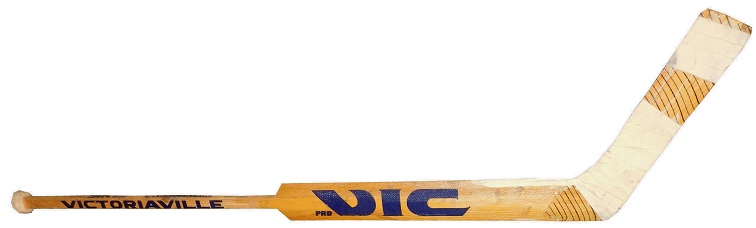 Goalie Alain Chevrier had a lengthy career, playing for the Devils, Blackhawks, Penguins, and Red Wings. He had a decent career, nothing really memorable. During his time with the Blackhawks, he used the VIC stick. It shows a lot of use.