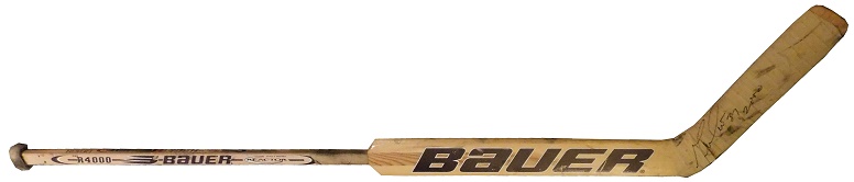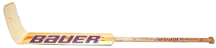 Guy Hebert played in the NHL from 1991 to 2001. He played 491 games, wining 191, and losing 222. During his playing career, he used this Bauer stick, which he autographed on the blade, and it shows nice use.