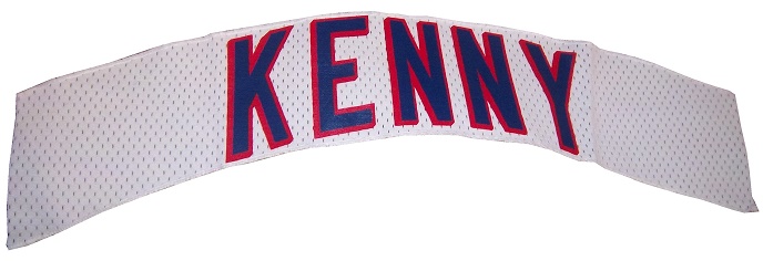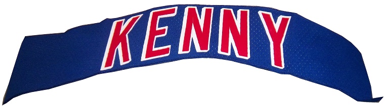 Rob Kenny was a minor league hockey player in the late 1980’s and 1990’s. Though he never made the team, he did go to the New York Rangers training camp, and during that camp, he used these nameplates, which were removed from the jersey.