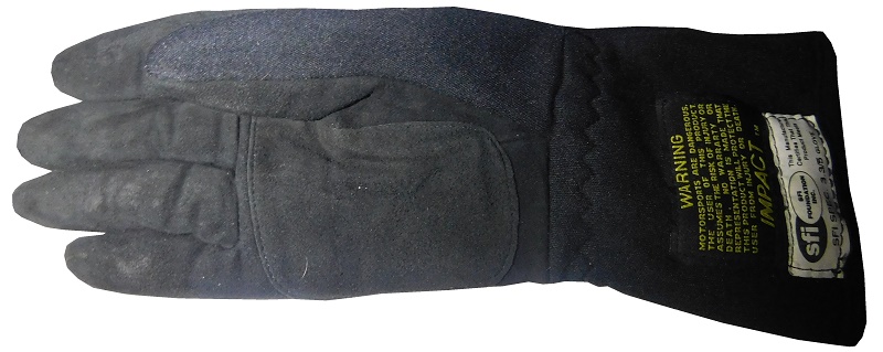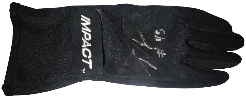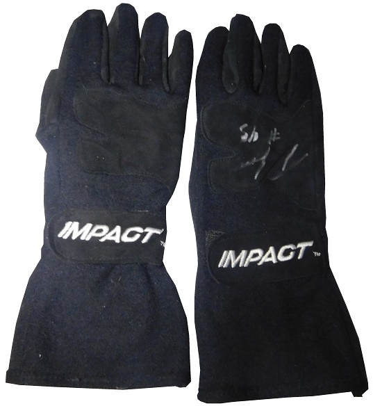 Justin South races everything from Super Late Models to Pro Late Models, and has raced on everything from dirt to asphalt. Like many small-time drivers, he has to buy his own equipment, and he is left with extras, such as these two right Impact! racing gloves, one of which he has autographed.