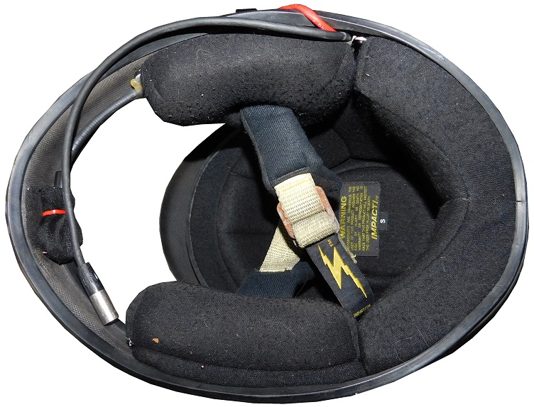 The interior of the helmet has an Impact warranty label, a small flag tag indicating the size as S, and the microphone equipment is still present.