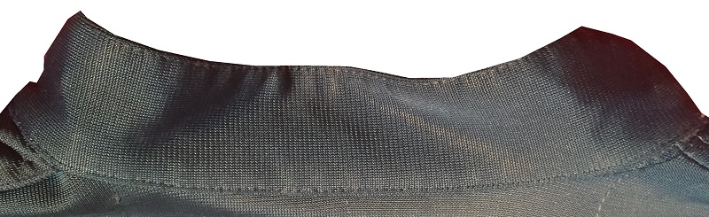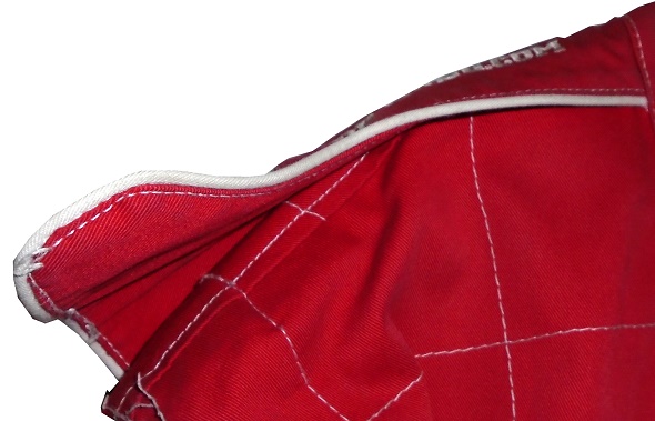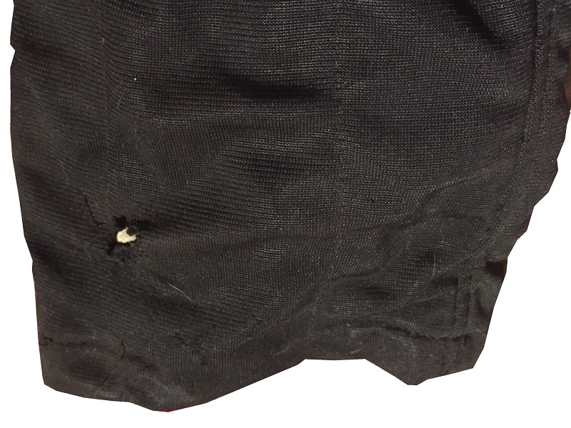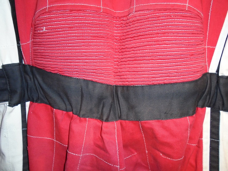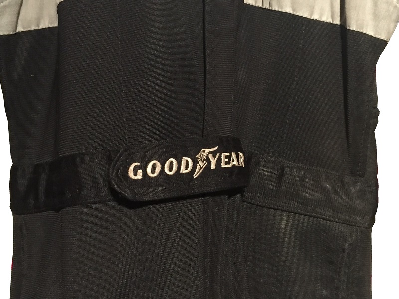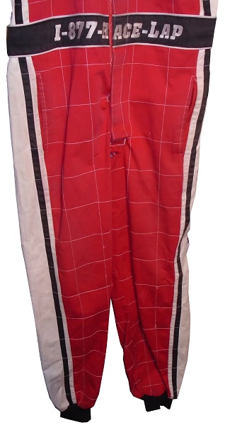 The front of the belt has 1-877-RACELAP embroidered into it. There is a tear in the fabric. The suit doesn’t use a zipper, but oddly uses Velcro.