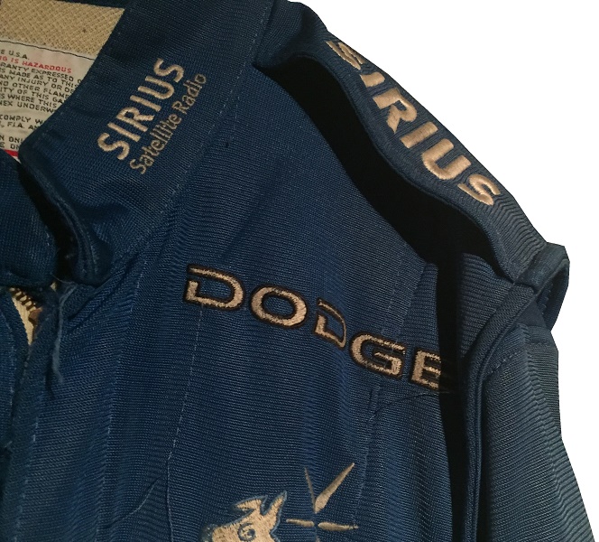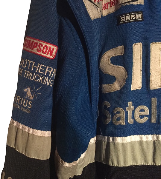 The right sleeve features a SIMPSON logo, a SOUTHERN PRIDE TRUCKING logo, and a SIRIUS SATELLITE RADIO logo on the top, and SIRIUS at the end of the sleeve in television position.