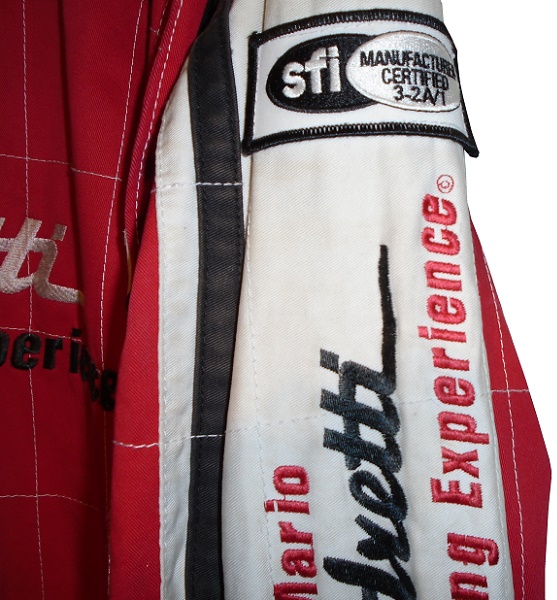 The left sleeve has the same MARIO ANDRETTI RACING EXPERIENCE as the right sleeve, but the SFI certification is also present.