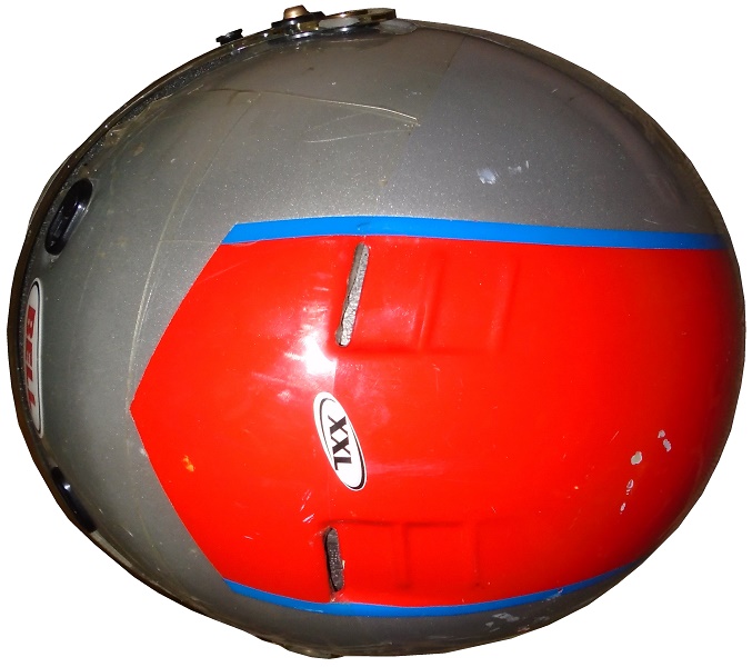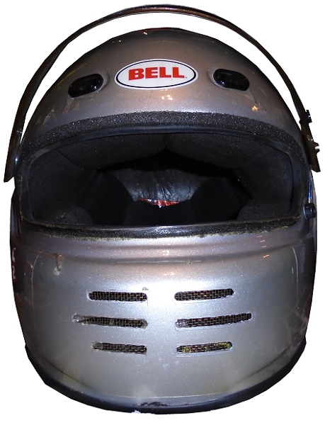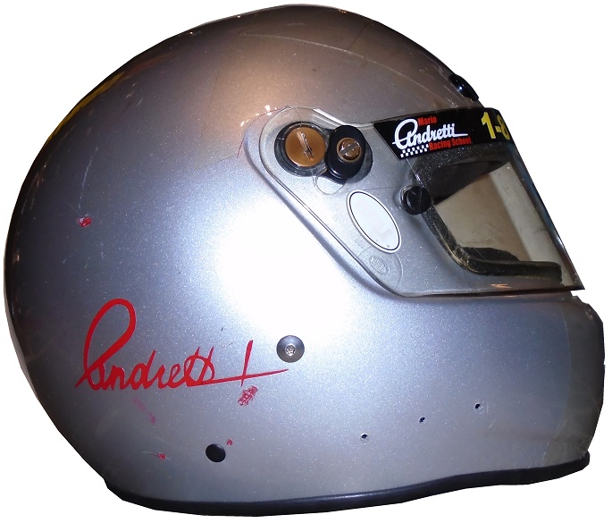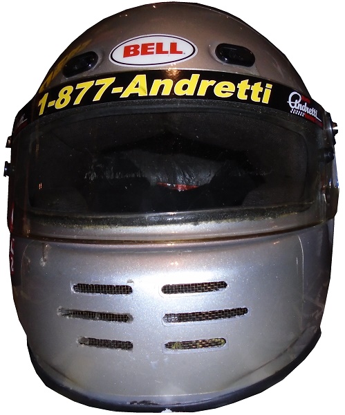 After his career ended, he opened up his own racing experience, The Mario Andretti Racing Experience, where you can pay to ride in, or even drive an IndyCar. He gives fans a chance to live their dreams. The helmets that he uses there are based on his distinctive silver and red helmet, such as this one.This Bell helmet has a lot of scuffs and scratches on it. On the left side, there is a large scratch, and someone has written “2426” on the sides.The front of the helmet has ventilation tabs, a helmet stripe with 1-877-ANDRETTI printed, some wear on the interior material, and some scratches. The right side features a large scratch, and several small scuff marks present.The huge red stripe that extends up the back has a lot of scratches and scuff marks.The top of the helmet features more scuff marks and scratches on the red stripe.The inside of the helmet is heavy damaged, with material loss, and other damage.In racing, you need a helmet and a suit if you are going to ride in a race car. I discussed the helmet, next week I’ll discuss the suit.