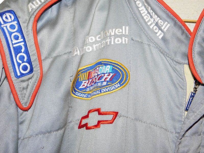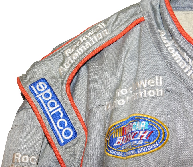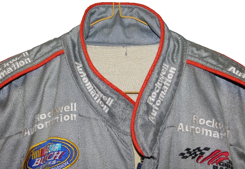 From 2003 to 2006 the #20 was sponsored by Milwaukee, Wisconsin-based Rockwell Automation. 2002 Truck Series Champion Mike Bliss raced the #20 in 2004, winning the Lowe’s Presents the SpongeBob SquarePants Movie 300, earned 6 top 5’s, and 14 top 10’s. During that time, a crew member wore this suit, which was later give to Steve DeSouza, who serves as Vice President of Xfinity Series Operations at Joe Gibbs Racing, which shows light wear.