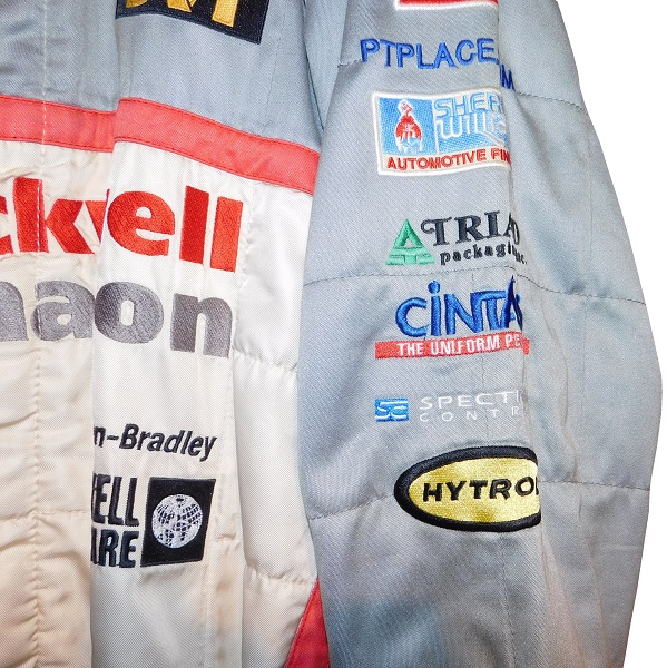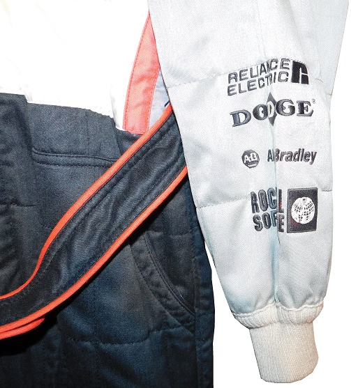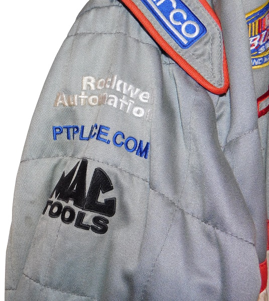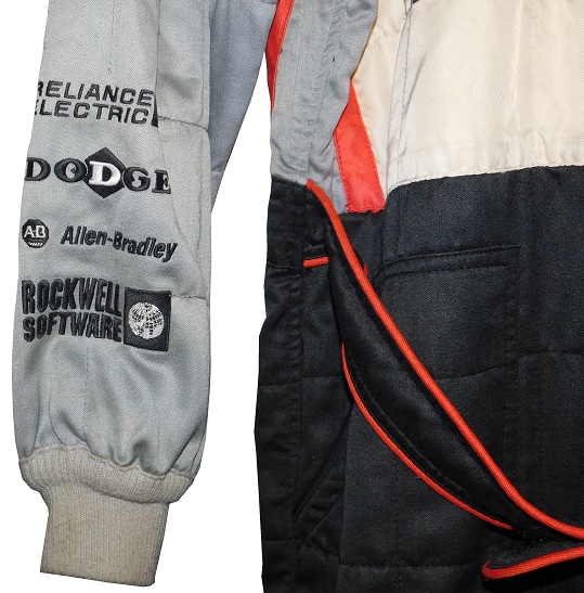The right sleeve has ROCKWELL AUTOMATION, PTPLACE.COM, MAC TOOLS, DODGE BEARINGS, RELIANCE ELECTRIC DRIVES, ALLEN-BRADLEY, and ROCKWELL SOFTWARE logos embroidered.The back of the suit features some very light wear.