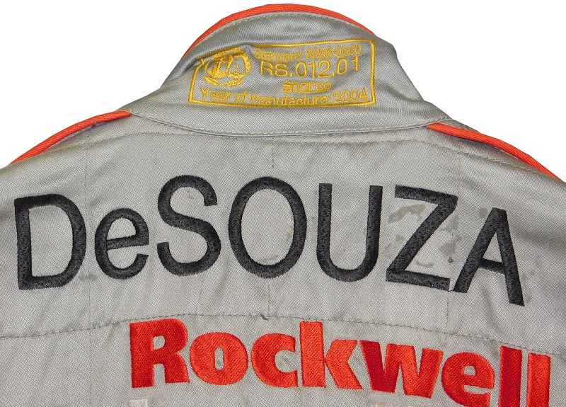 The back of the neck features an FIA STANDARD 8856-2000 RS.012.01 logo, which indicates that the suit was made in 2004. Below that is the name DeSOUZA, which is embroidered into the suit. The area that the name is embroidered shows evidence of a nameplate having been removed.