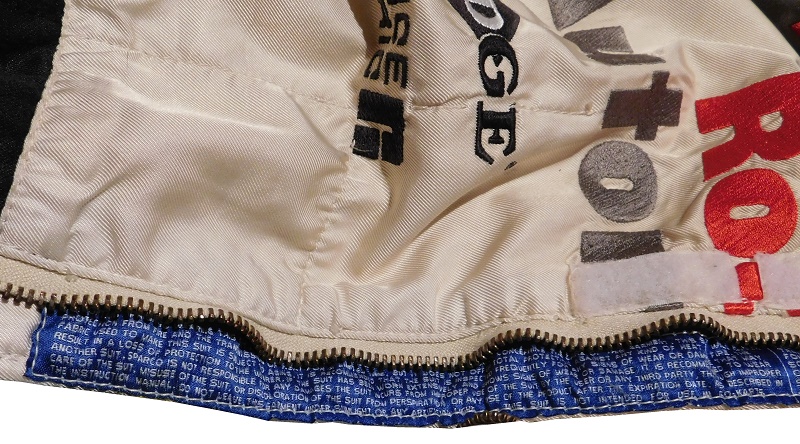There is no evidence that DeSouza was an active member of the pit crew. It may have been a gift, or DeSouza was a backup crew member. The area around the name shows evidence of a nameplate being removed, which isn’t that shocking, since these suits cost close to $2000, and teams often recycle suits when crew members leave the team. The fact that the suit doesn’t show as much wear as other suits could also mean that the suit was made for DeSouza specifically. Many crew chiefs wear firesuits, due to the danger posed by fire, so it makes sense that DeSouza would want to wear a firesuit. I don’t know everything about this suit, but I do know one thing…it is a nice looking suit.