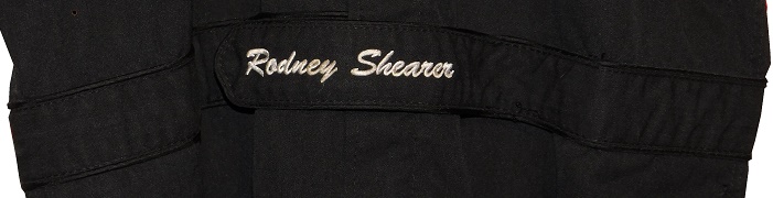 The belt features RODNEY SHEARER embroidered in white on the black fabric.