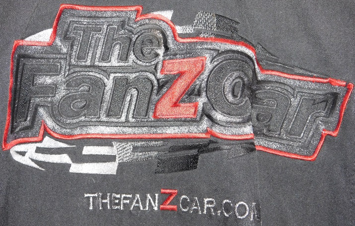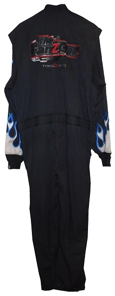 The back torso features a THE FANZCAR.COM logo embroidered, which has been blacked out using Sharpie. This is so the suit can be recycled.
