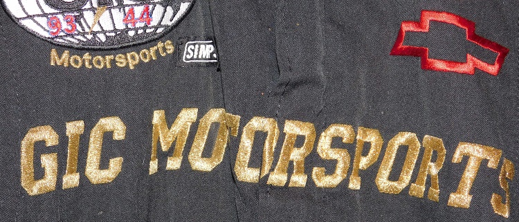 The front torso has GIC MOTORSPORTS embroidered in gold across it.