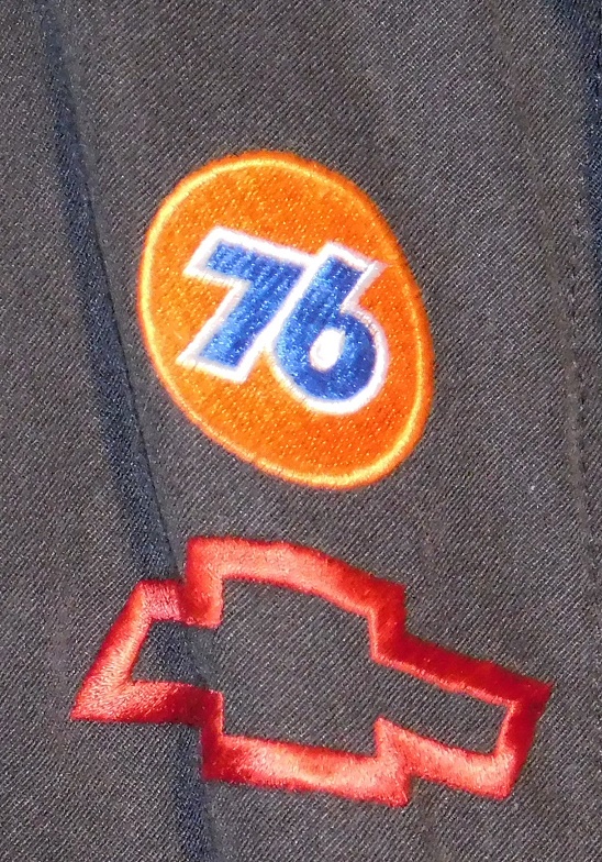 The left chest features a UNOCAL 76 logo and a CHEVY bow tie logo embroidered.