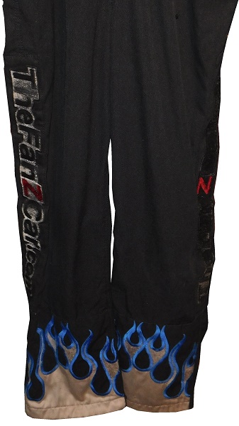 The legs feature THE FANZCAR.COM logos in television position, which have been blacked out with Sharpie. The cuffs show light fire discoloration, and have blue and white flame designs.