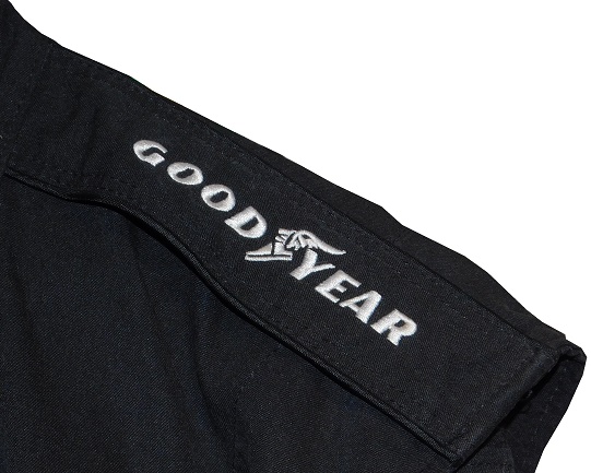 The black shoulder epaulets have GOODYEAR embroidered in white.