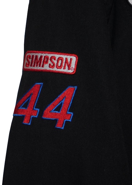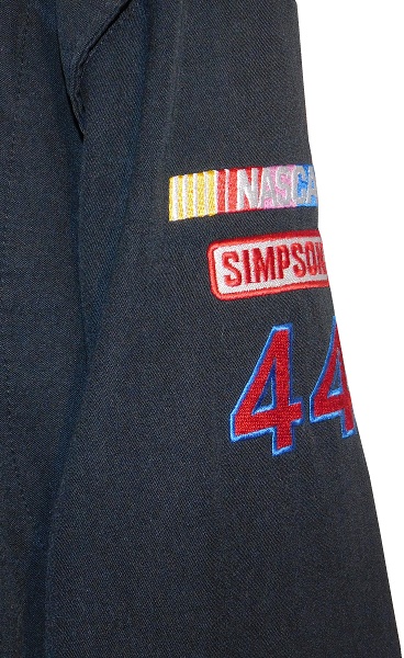 The left sleeve has a NASCAR logo embroidered, a SIMPSON patch sewn it, and 44 embroidered. The cuffs have the same flame design as the leg cuffs.