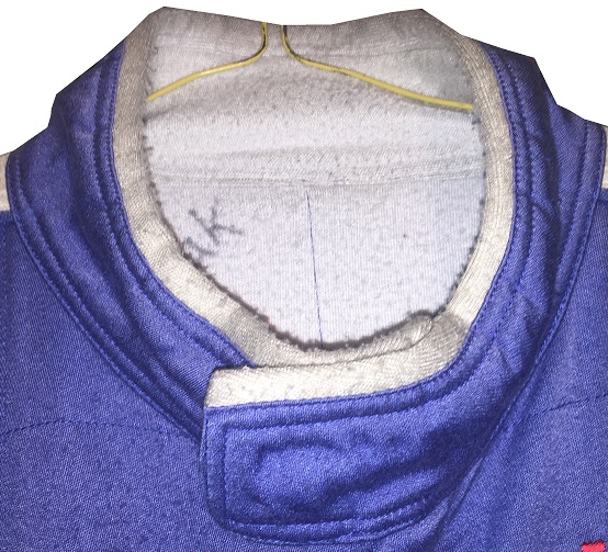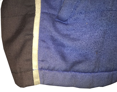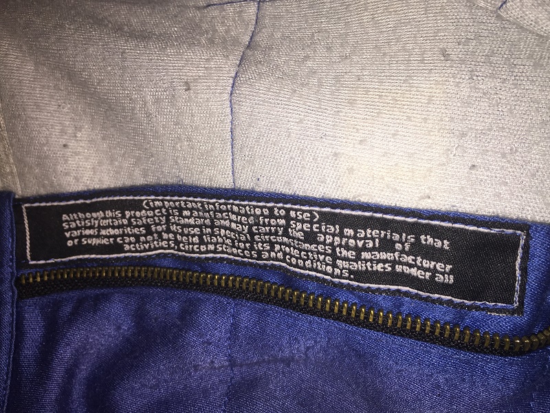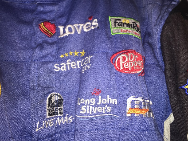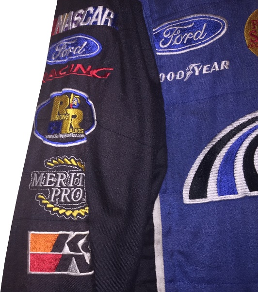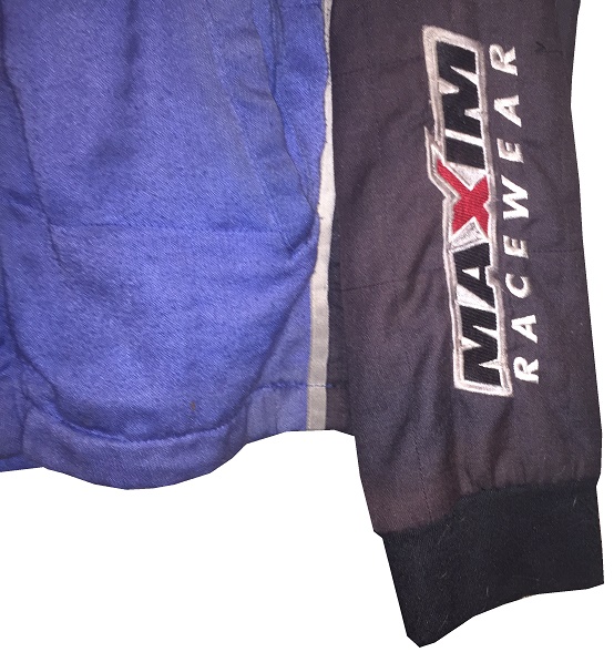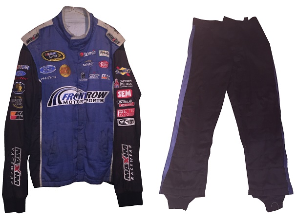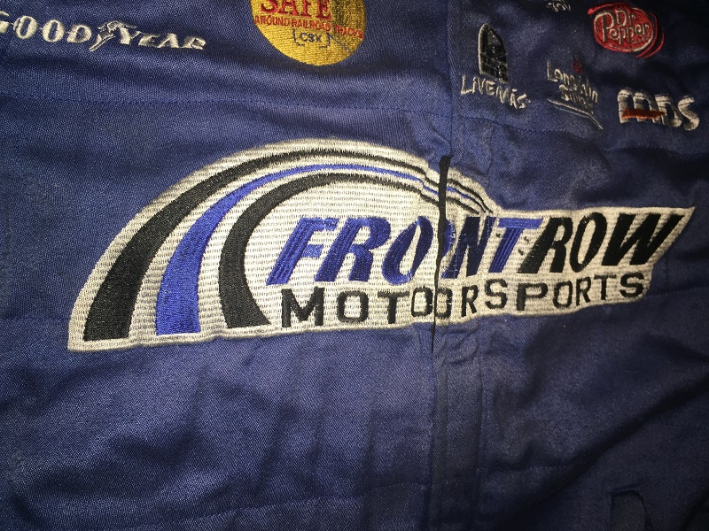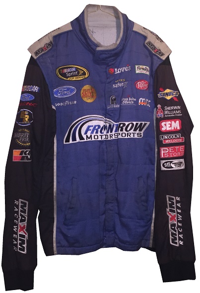 Founded some time in the early 2010’s, Maxim Racewear was a small-time operation that provided crew uniforms to lower-end teams, and eventually was found by some teams in the upper echelons of NASCAR, including Front Row Motorsports. The company went out of business around 2015, so information on them is difficult to get. One team they made pit crew uniforms for is Front Row Motorsports, as evidenced by this 2013-2014 example. This mismatched suit shows decent use, with scuff marks and stains.The blue collar has silver accents, and is unadorned.The name NOVAK is written in Sharpie in the cowl.The right chest has NASCAR SPRINT CUP SERIES,FORD,CSX PLAY IT SAFE, and GOODYEAR logos embroidered into it.The left chest features LOVE’S TRUCK STOPS, FARM RICH, SAFECAR.GOV, DR PEPPER, TACO BELL, LONG JOHN SILVERS, and MDS logos embroidered.The front torso features a FRONT ROW MOTORSPORTS logo embroidered into it.Inside the front zipper of the jacket features a Maxim Racewear warranty label.The sides of the jacket have Velcro comfort straps on the back. The shoulder epaulets have FRONT ROW MOTORSPORTS embroidered logos, as well as MAXIM RACEWEAR logos present. The right sleeve has NASCAR, FORD RACING, RACING RADIOS,MERIT PRO, and K&N logos on the upper sleeve, and a MAXIM RACEWEAR logo in television position on the end of the sleeve. The left sleeve features SUNOCO, SHERWIN WILLIAMS, SEM, LINCOLN WELDERS, THE PETE STORE, and the SFI certification on the upper sleeve, and a MAXIM RACEWEAR logo in television position at the end of the sleeve. The back of the jacket shows some wear with a few scuff marks and stains.The back of the neck is unadorned.The back torso has @FRONTROWNASCAR, I BREAK FOR TRAINS, and a FRONT ROW MOTORSPORTS logo embroidered into it.The pants show decent use, with the tag destroyed, and some scuff marks.In the inside of the pants is written 38 SPARE and some Asian lettering.There is a tag in the waist of the pants, but the pants have been washed some many times, the tag has been destroyed.The black pants have a blue stripe up the sides, and has boot cuffs, though the cuffs do show some wear. The back of the pants show some light wear.Front Row Motorsports is a little team that can, and they have a number of wins in the Cup Series. They have had a lot of talented drivers, and I hope they have a lot of success in the future.