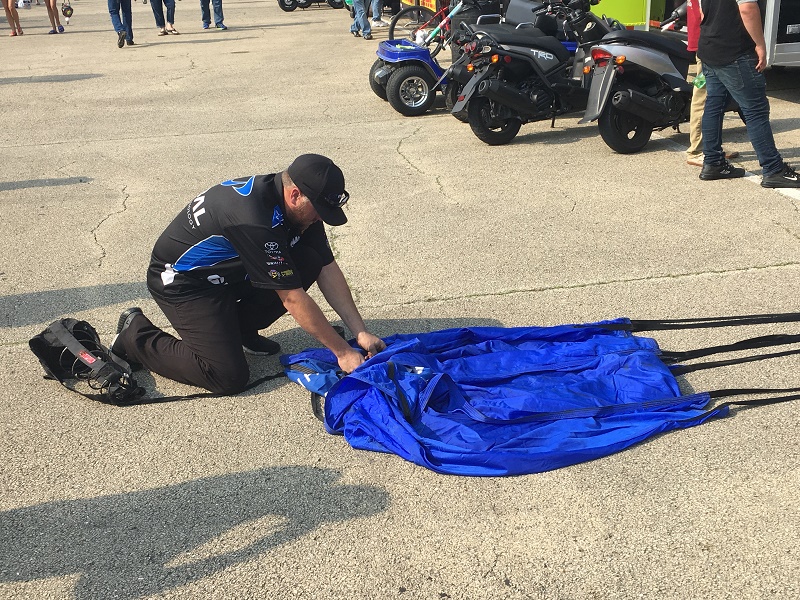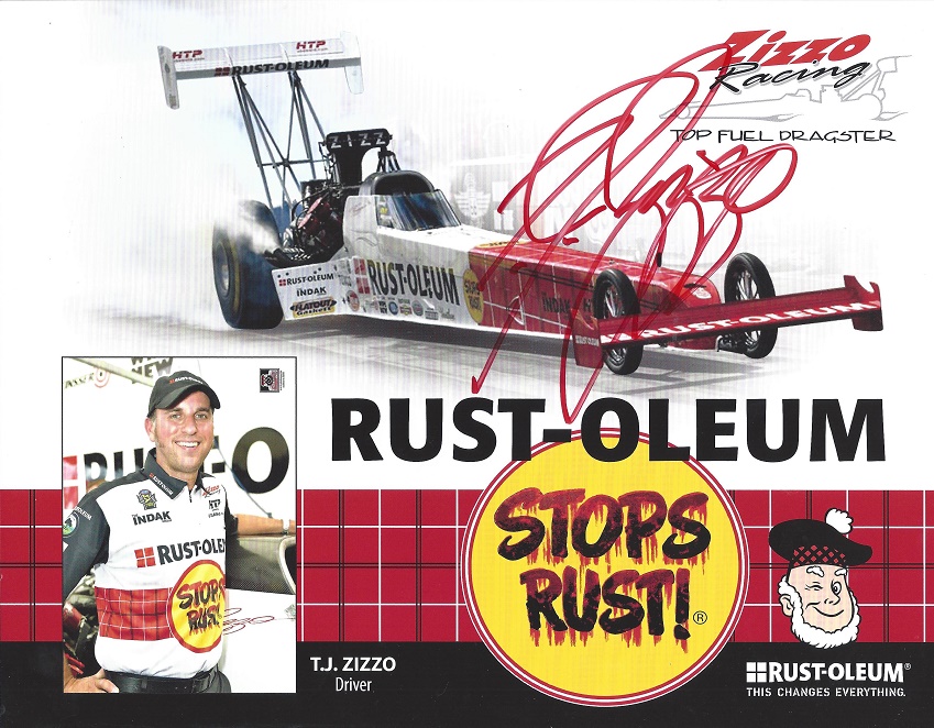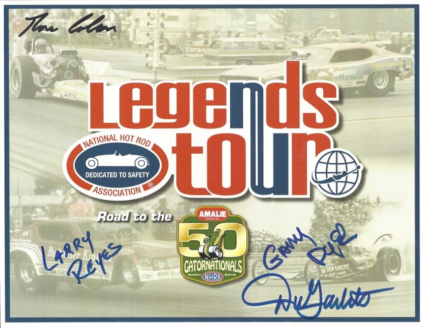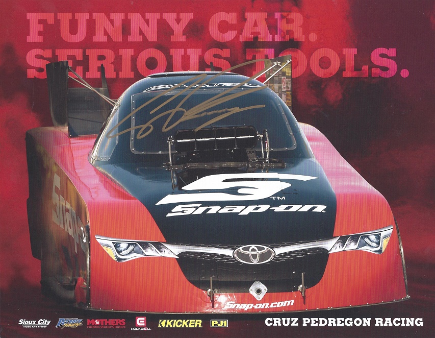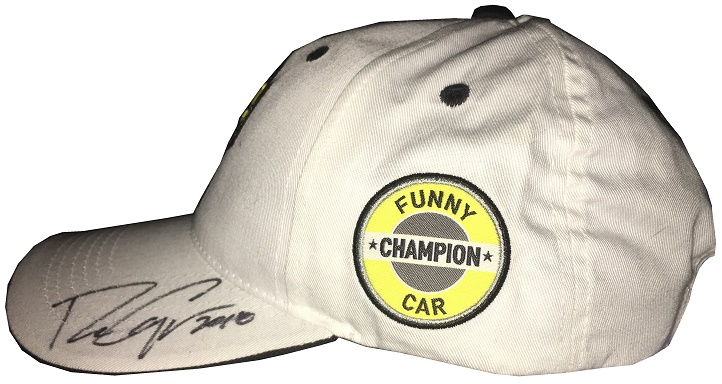 Also, since I have interviewed Jack Beckman, I purchased an Infinite Hero Challenge Coin. This year’s design is done in memory of the late Terry Chandler, who passed away from cancer prior to the 2017 event. The front has a heart design with Chandler’s initials. The back of the coin has the Infinite Hero logo, with blue enamel. Jack also autographed a copy of the Infinite Hero pledge. I also came across this Cruz Pedregon race-used visor. It’s a Simpson visor, which shows a number of scratches, and scuff marks, and Cruz has autographed the visor with the inscription “2X FC CHAMP!.” After getting my coin and my visor, we decided to head back home. It was a great day, but then any day watching racing is a great day!