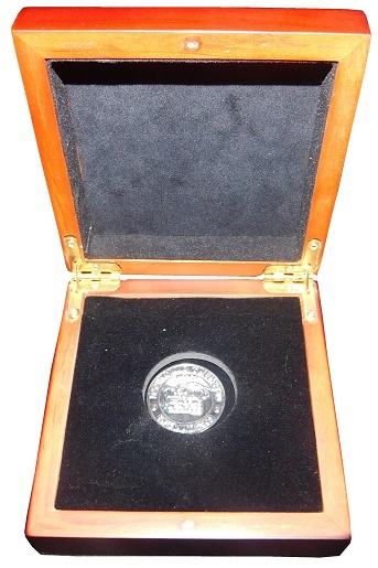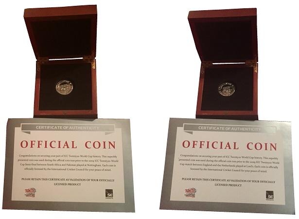 The specially made coin is not sold as a replica, and comes in a customized box, with an International Cricket Council logo. The box is about 4 inches square.