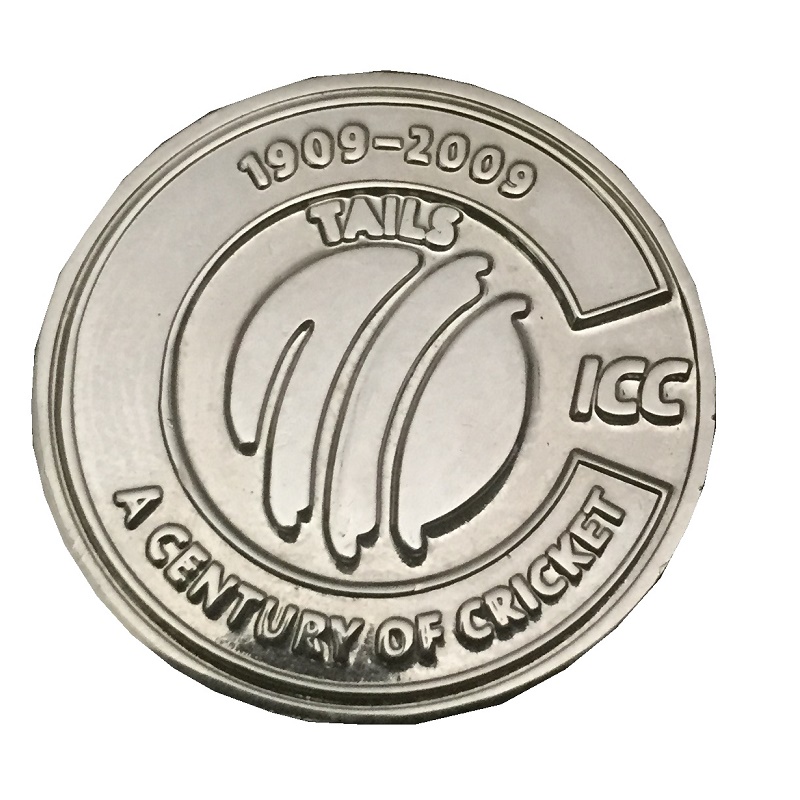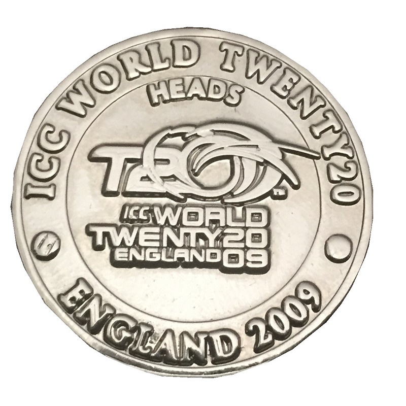 The coin itself is slightly larger than an American quarter, though much smaller than an NFL toss coin. The heads and tails are marked. The heads side features a 2009 ICC Twenty20 logo, with England 2009. The tails section features an ICC logo, with a 100th anniversary commemoration.